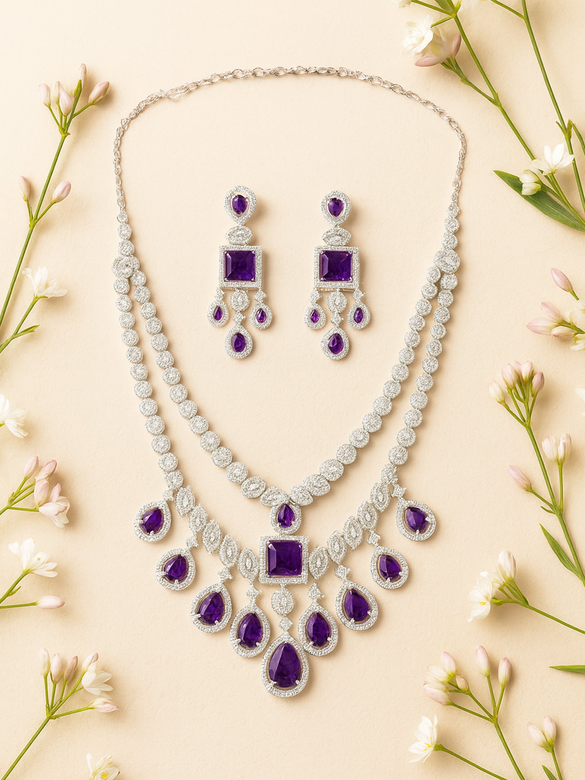 American Diamond Purple 2 Layer Designer Jewellery Set For Women And Girls