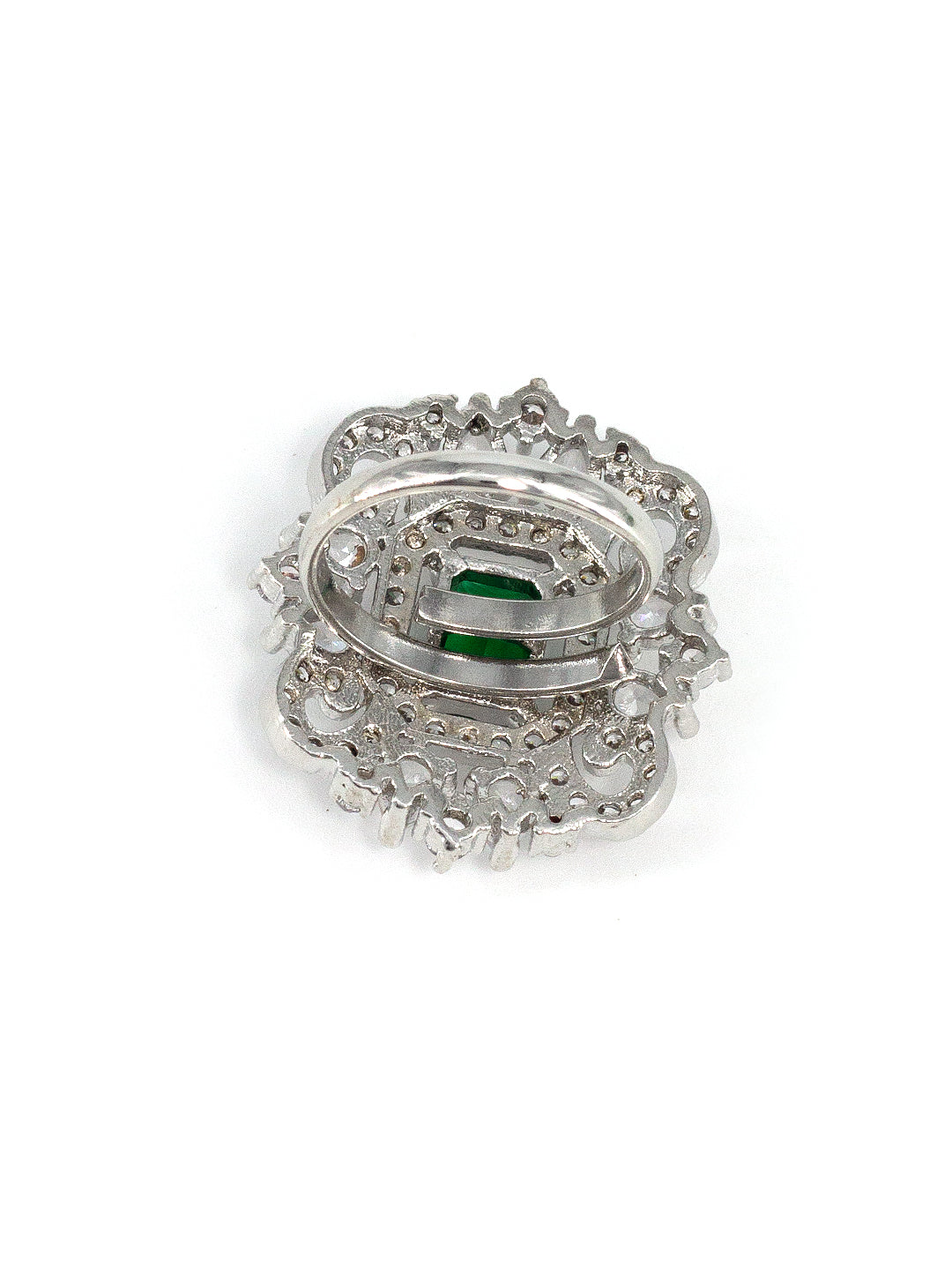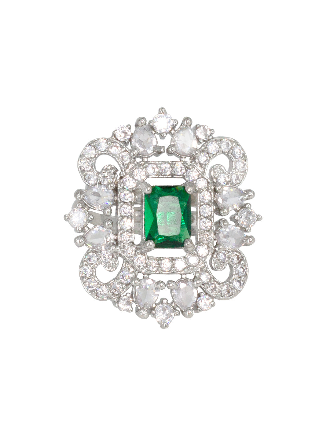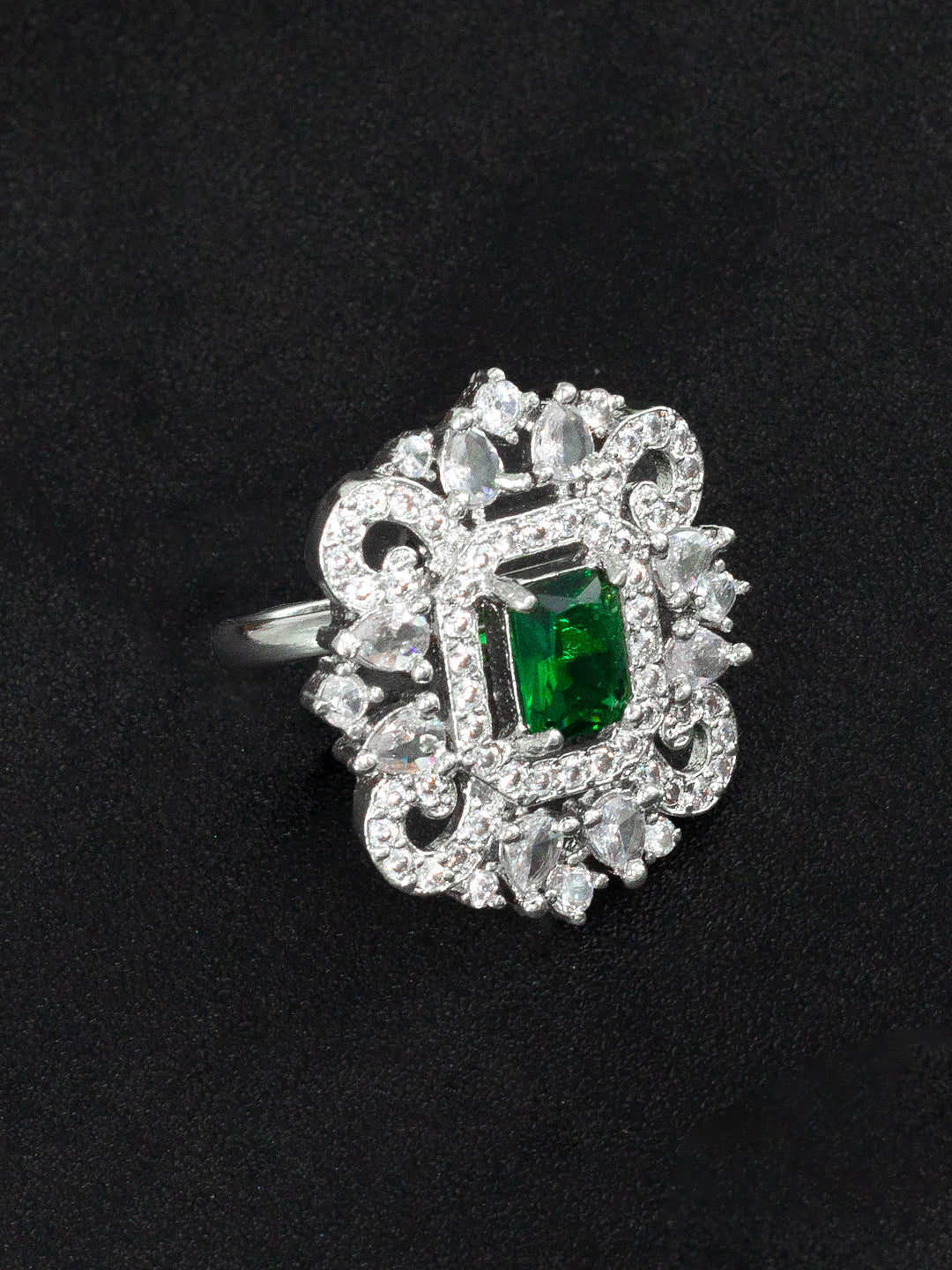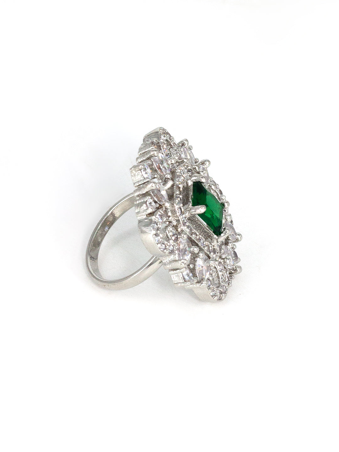 Rhodium Plated Green American Diamond Vintage Adjustable Finger Ring