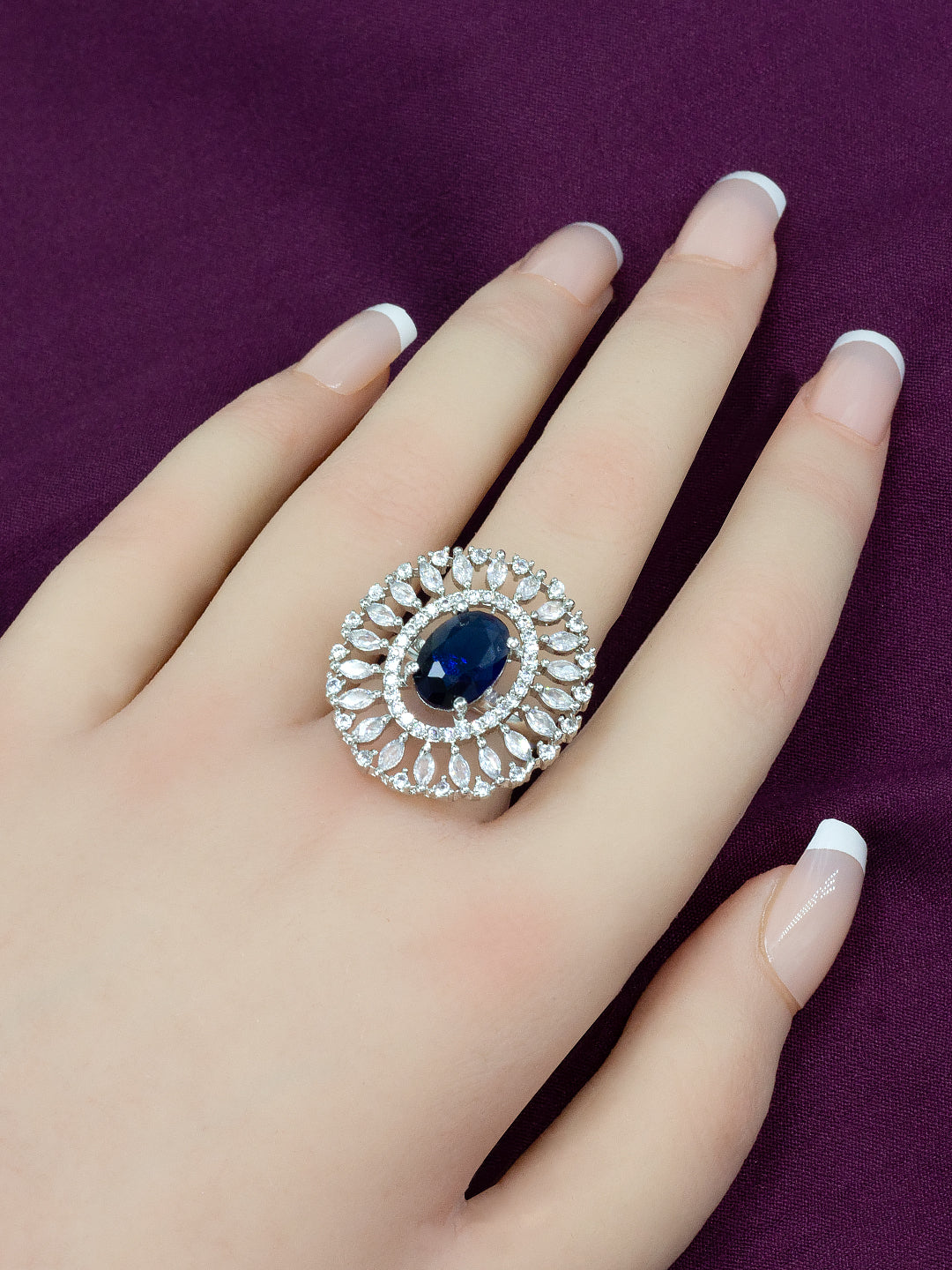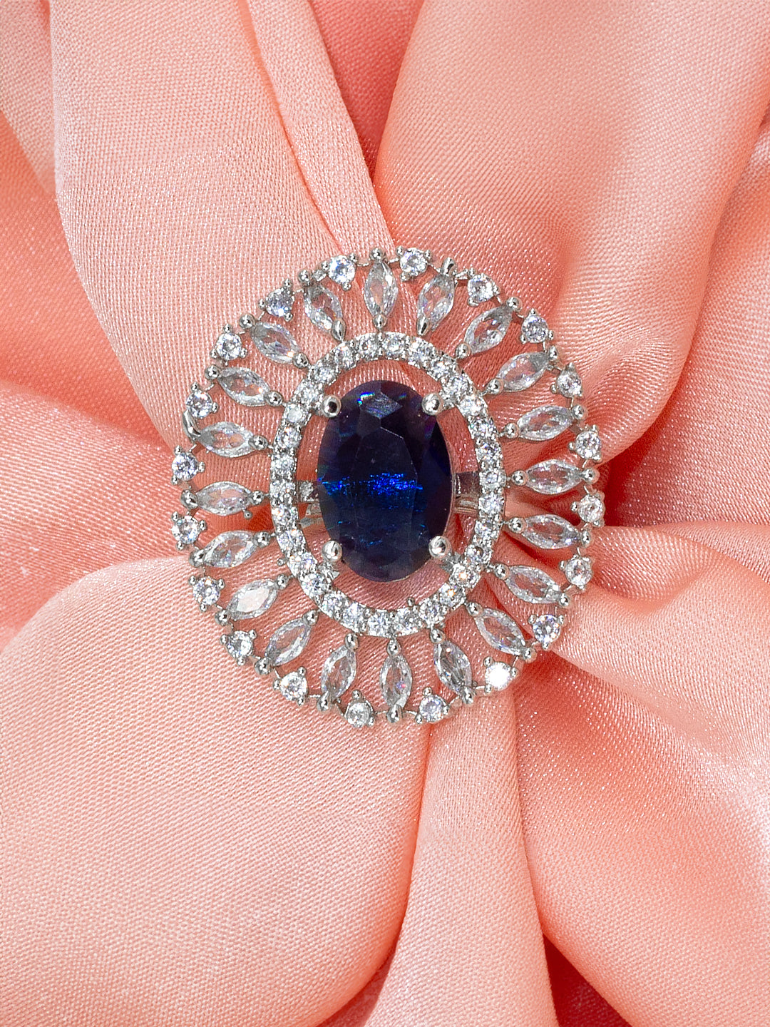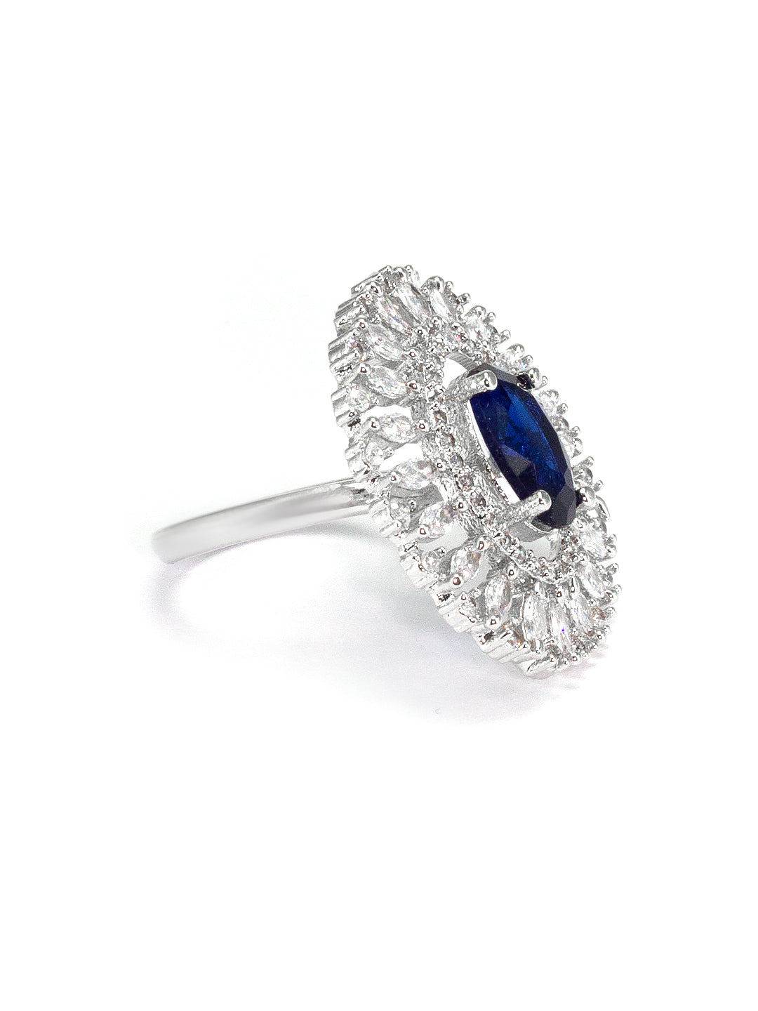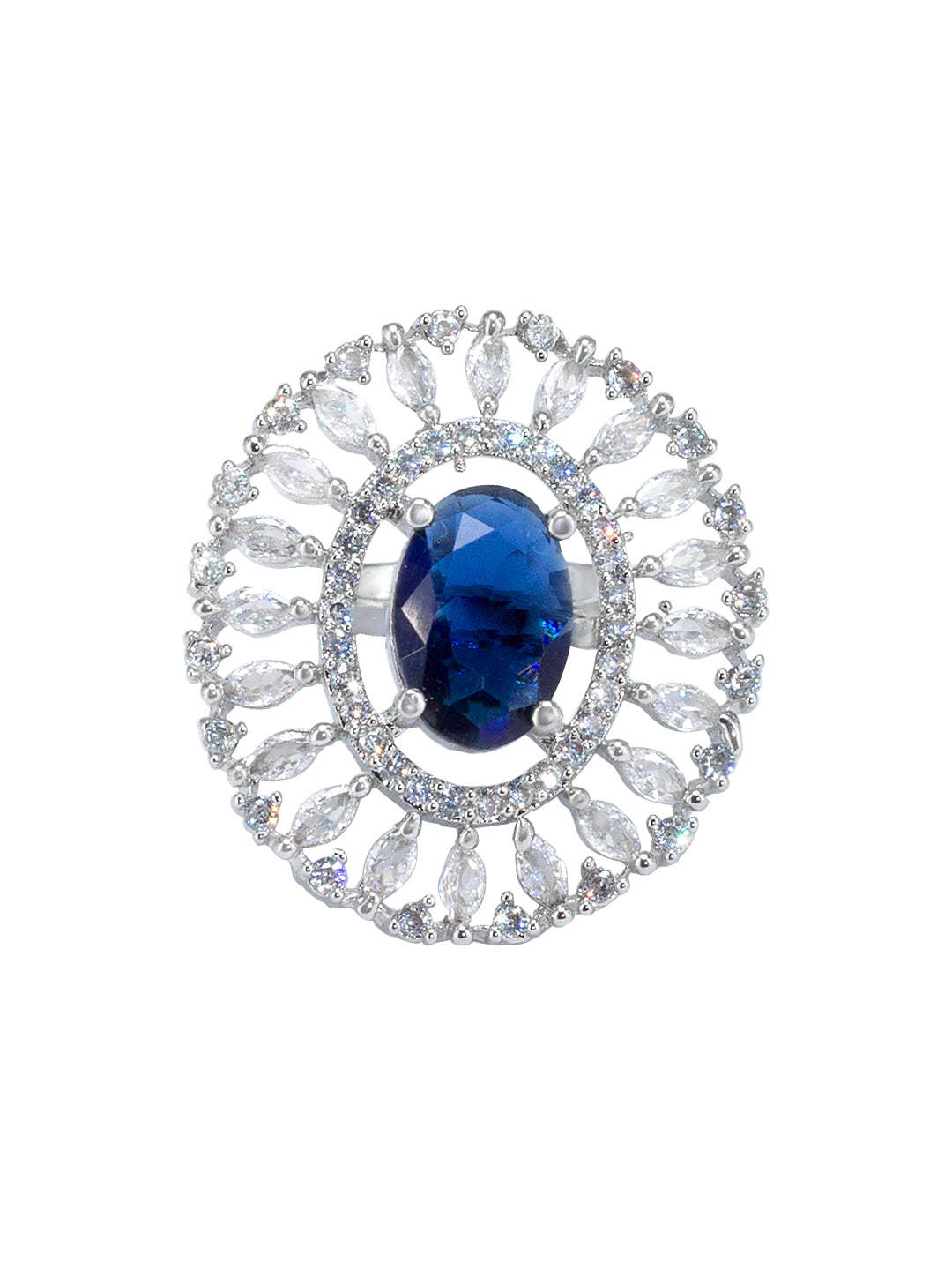 Rhodium Plated Blue American Diamond Oval Shaped Adjustable Finger Ring