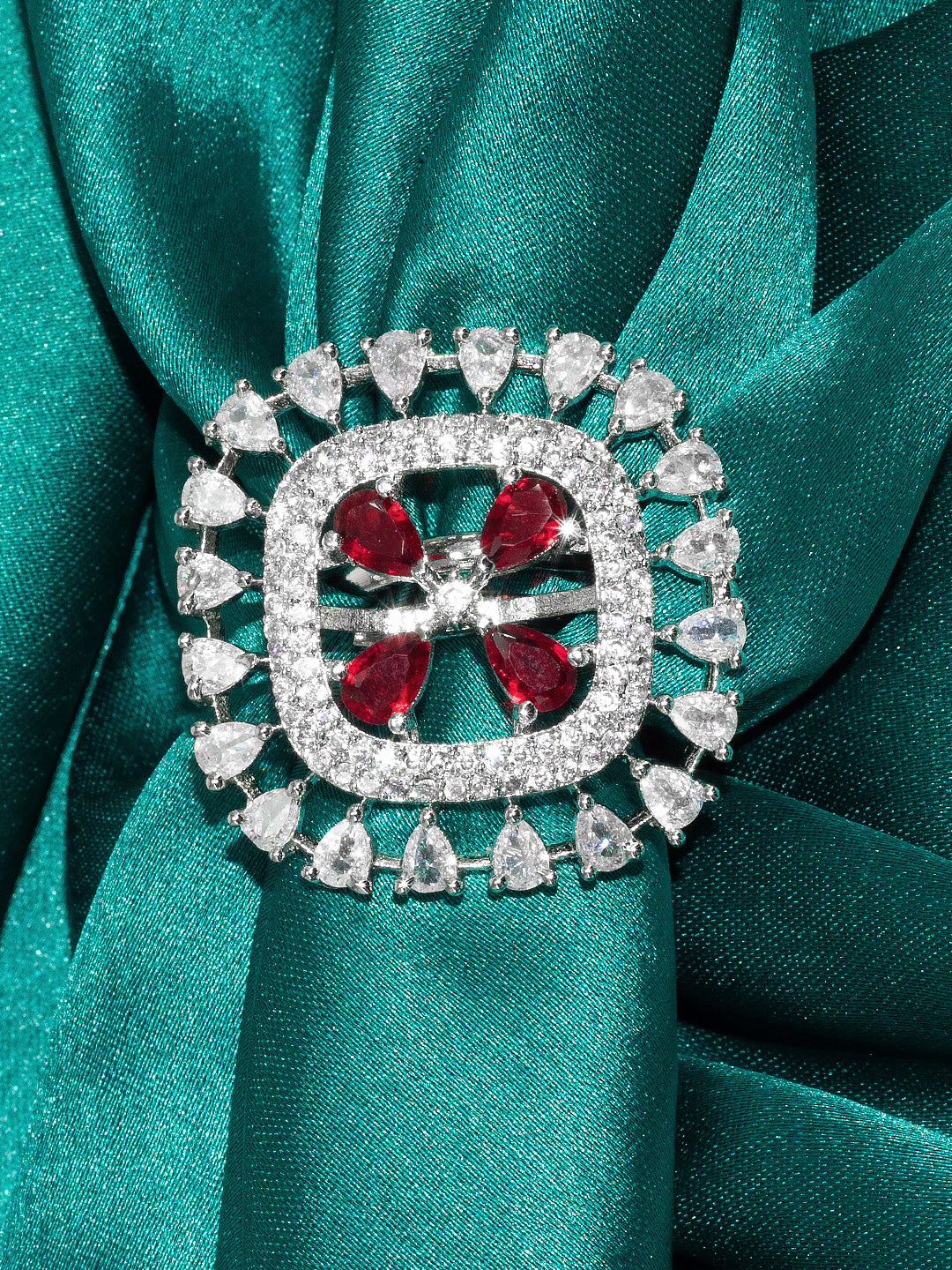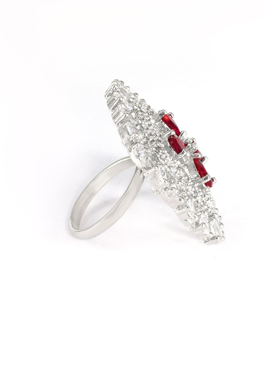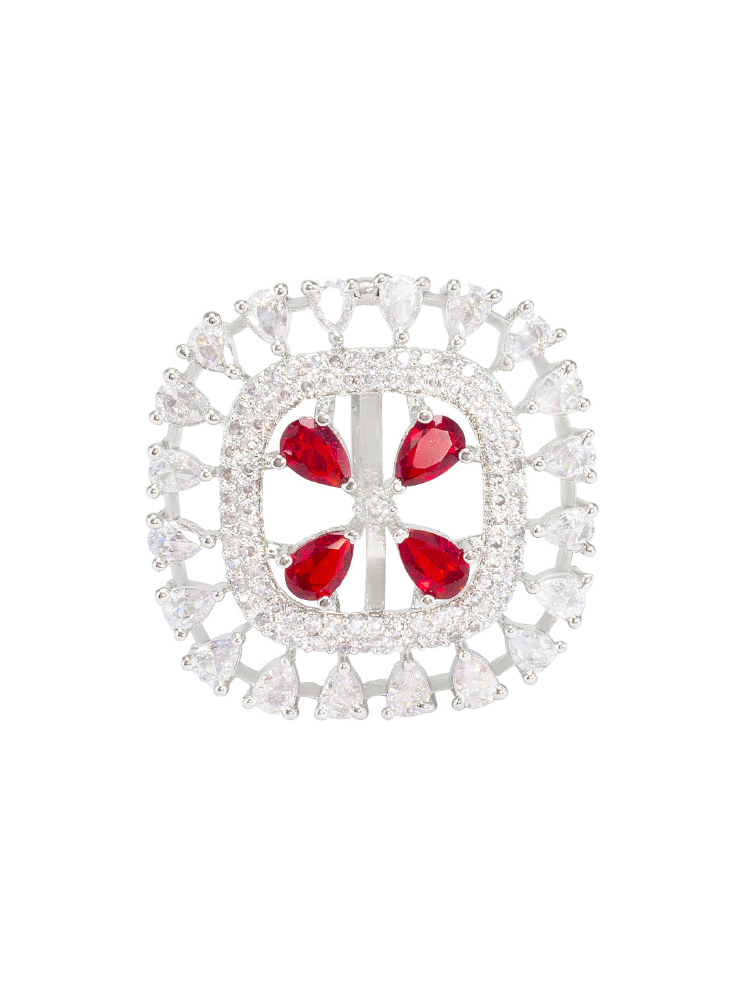 Rhodium Plated Red American Diamond Square Adjustable Finger Ring