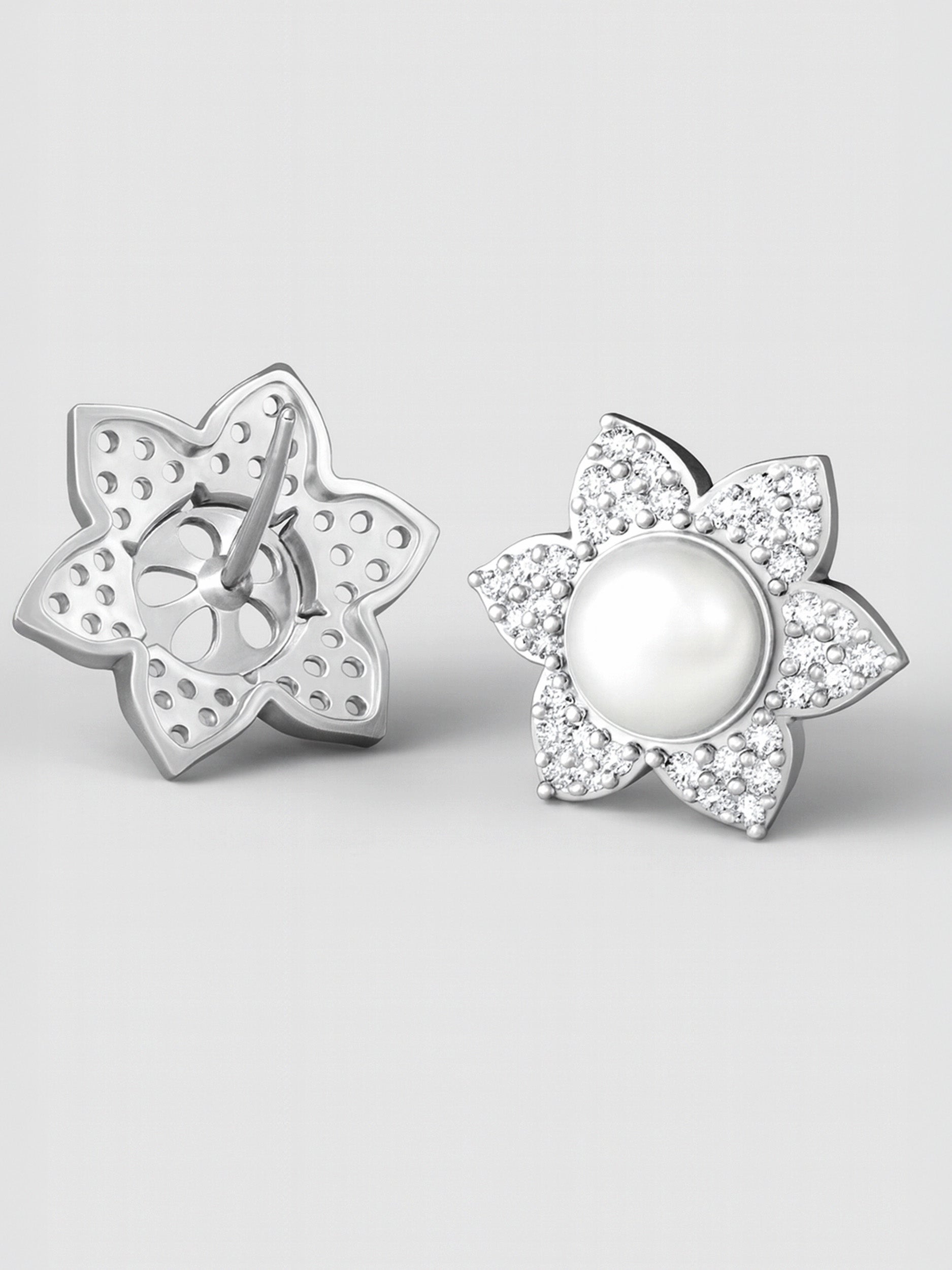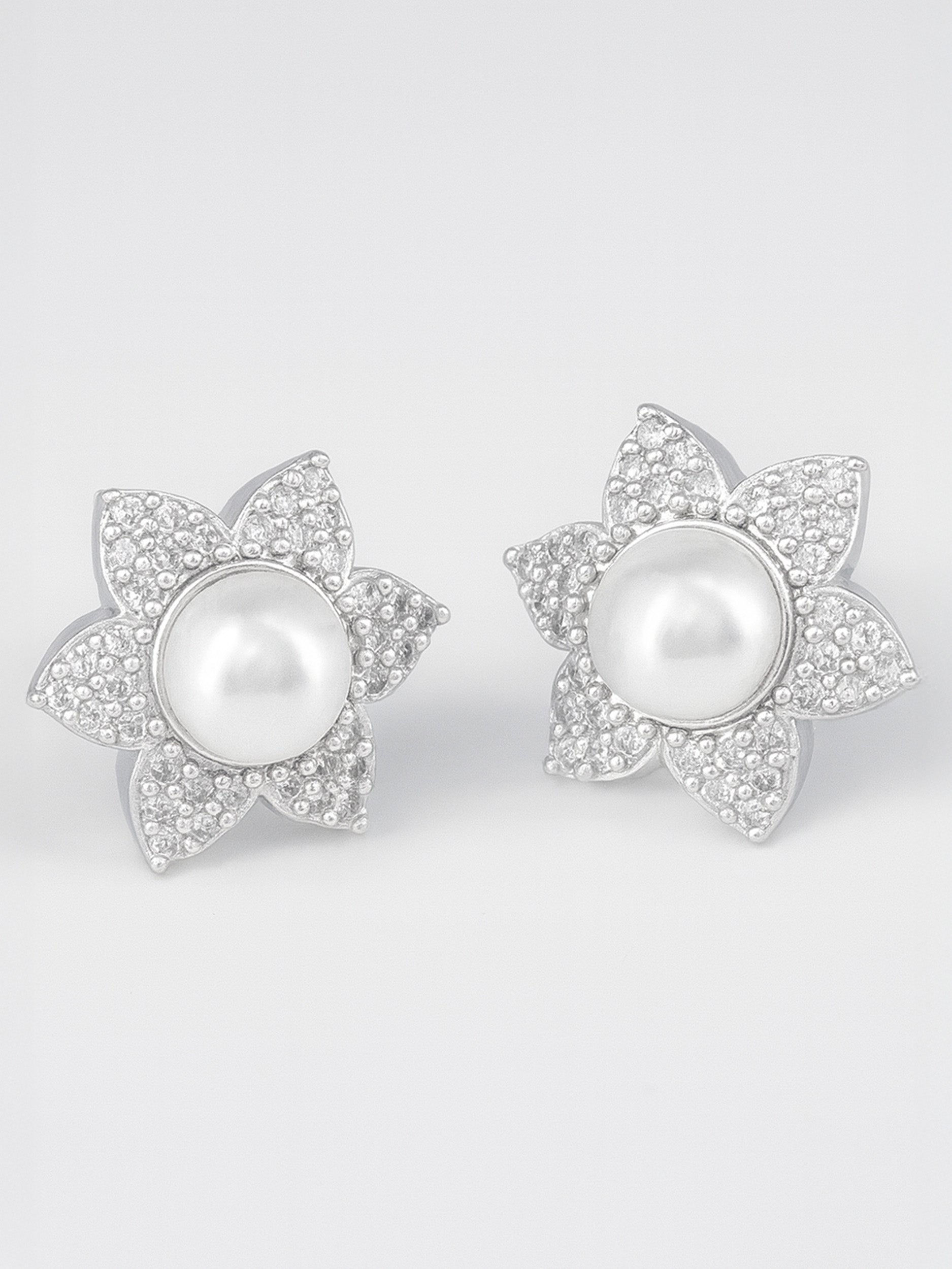 Silver Plated American Diamond with Faux Pearl Studded Floral Stud Earrings with Post & Back Closure.
