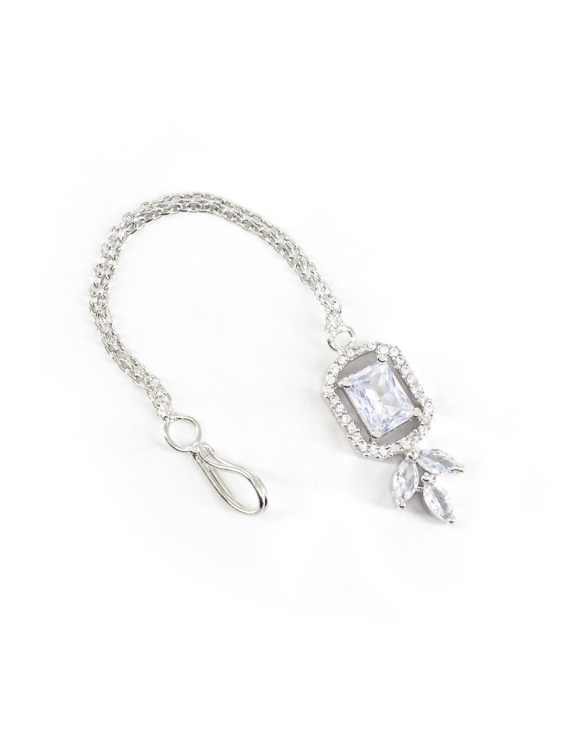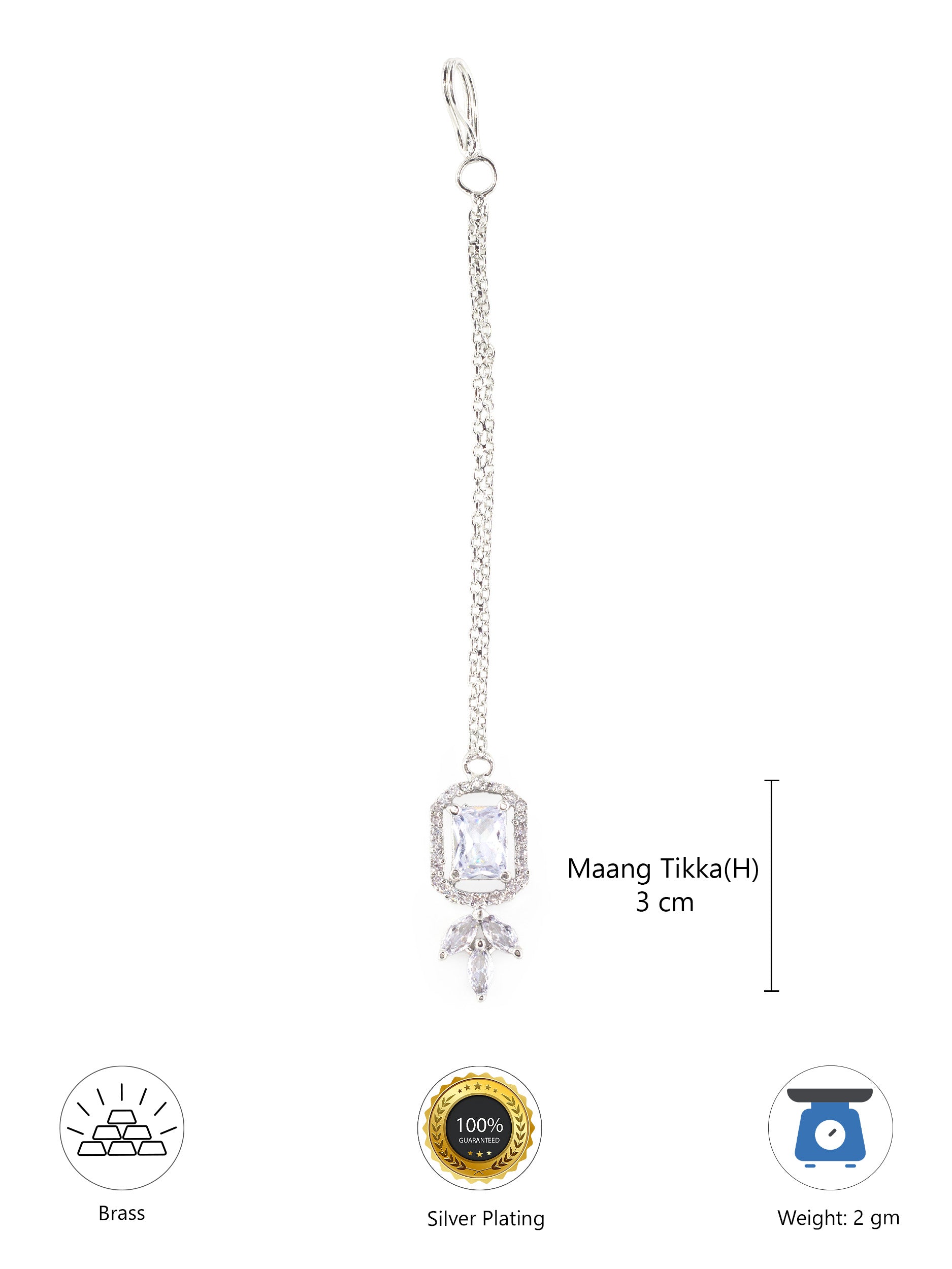 Rhodium Plated AD Maang Tikka for Women secured with S-hook Closure.