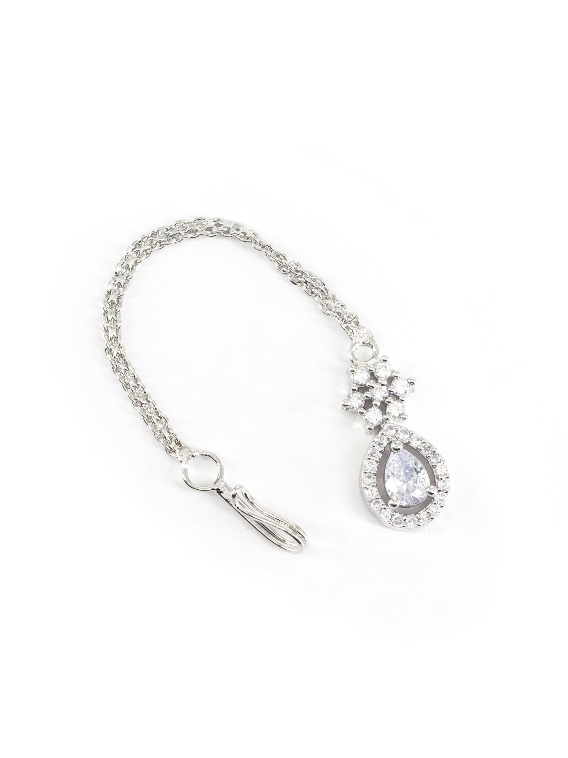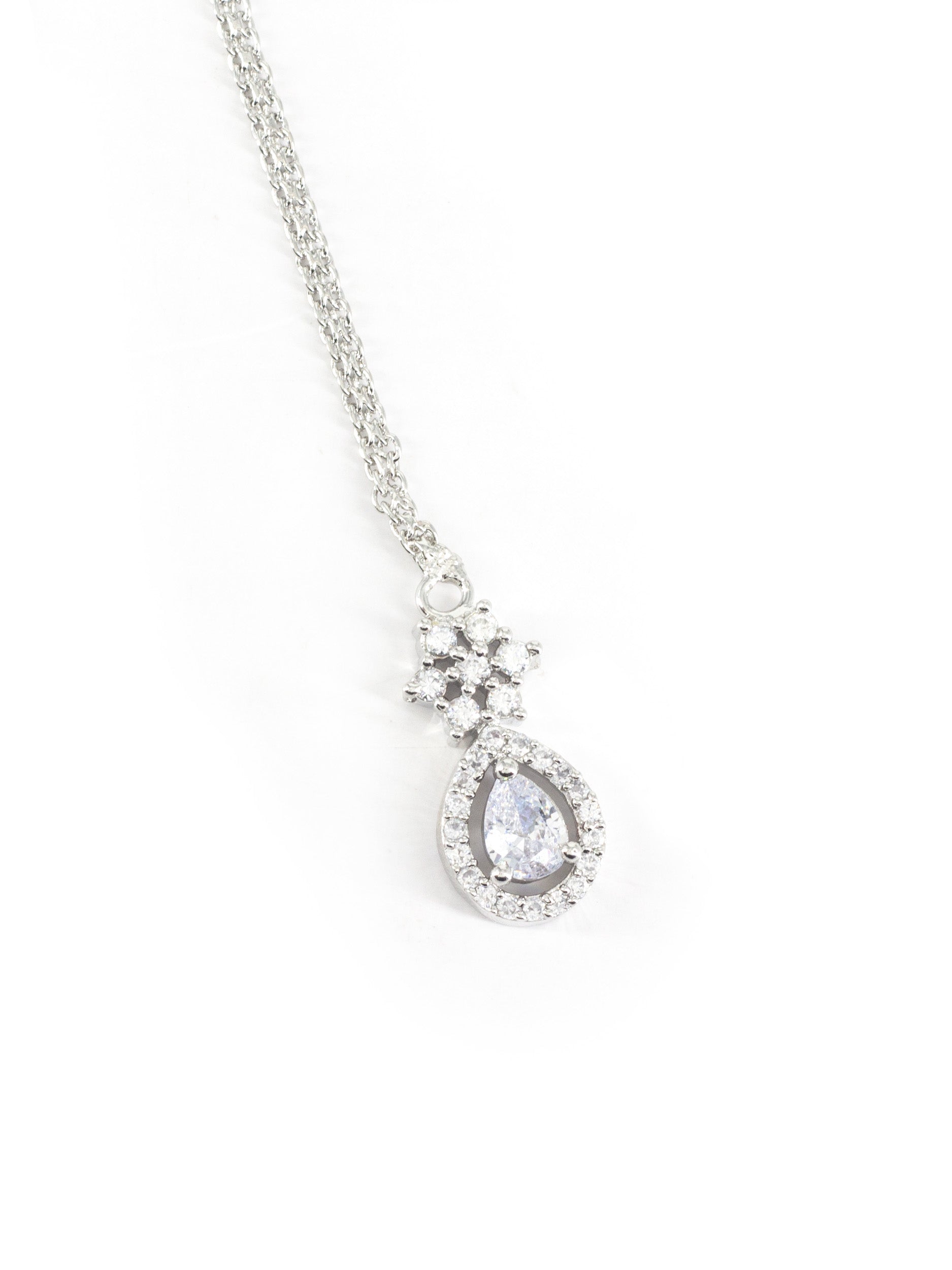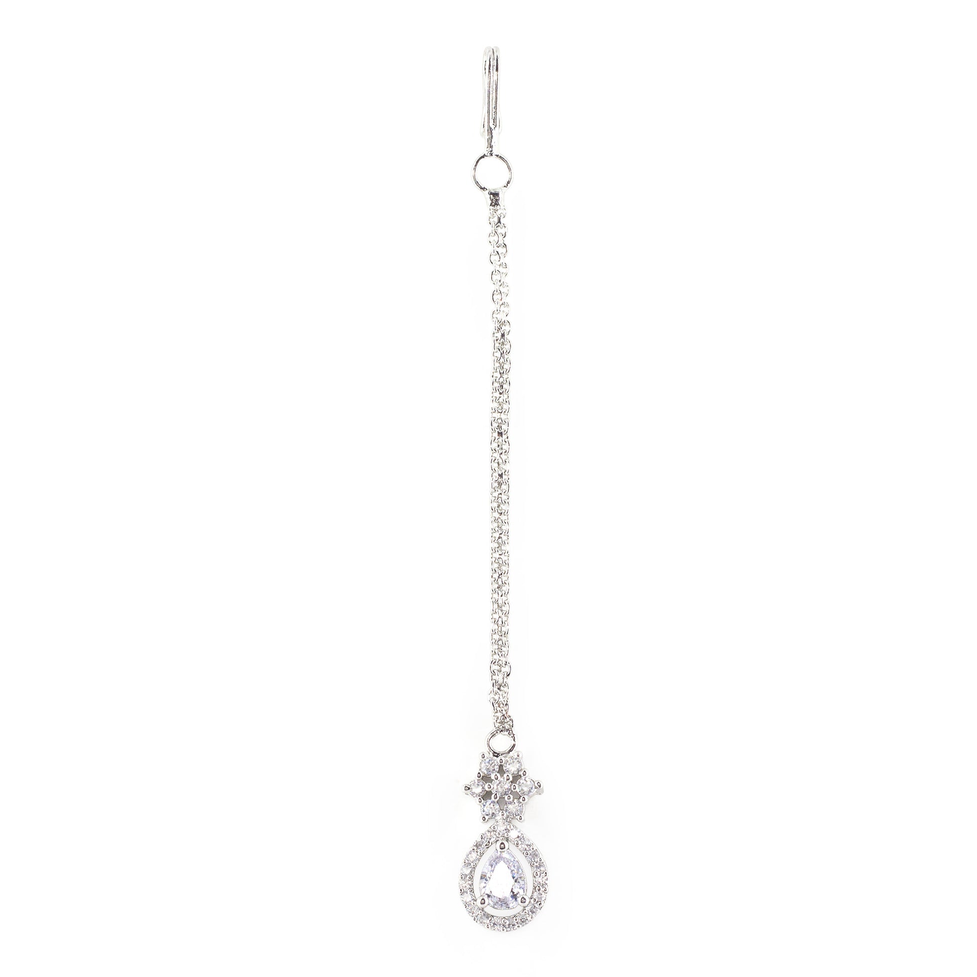 Rhodium Plated AD Teardrop Maang Tikka secured with S-hook Closure.