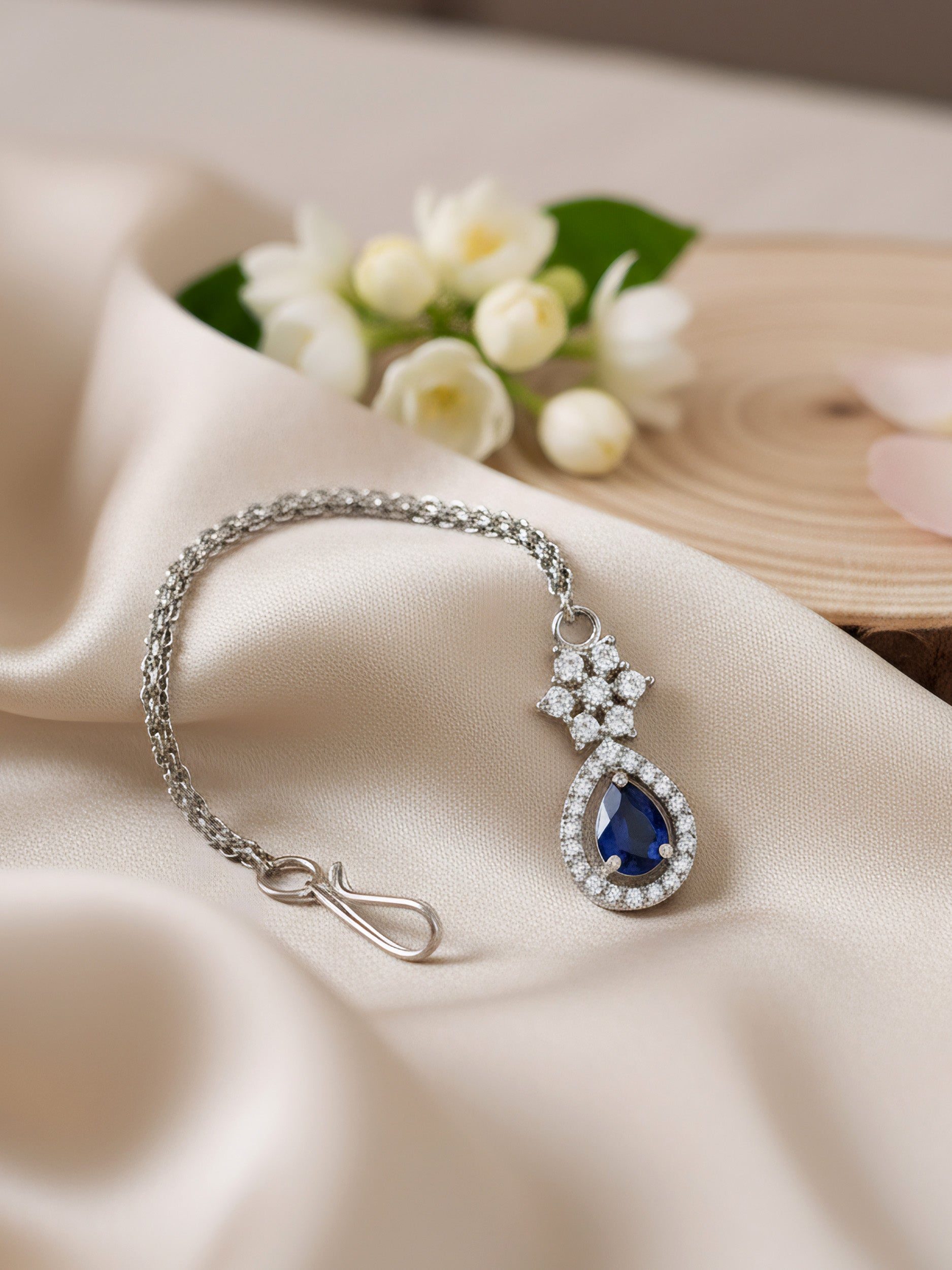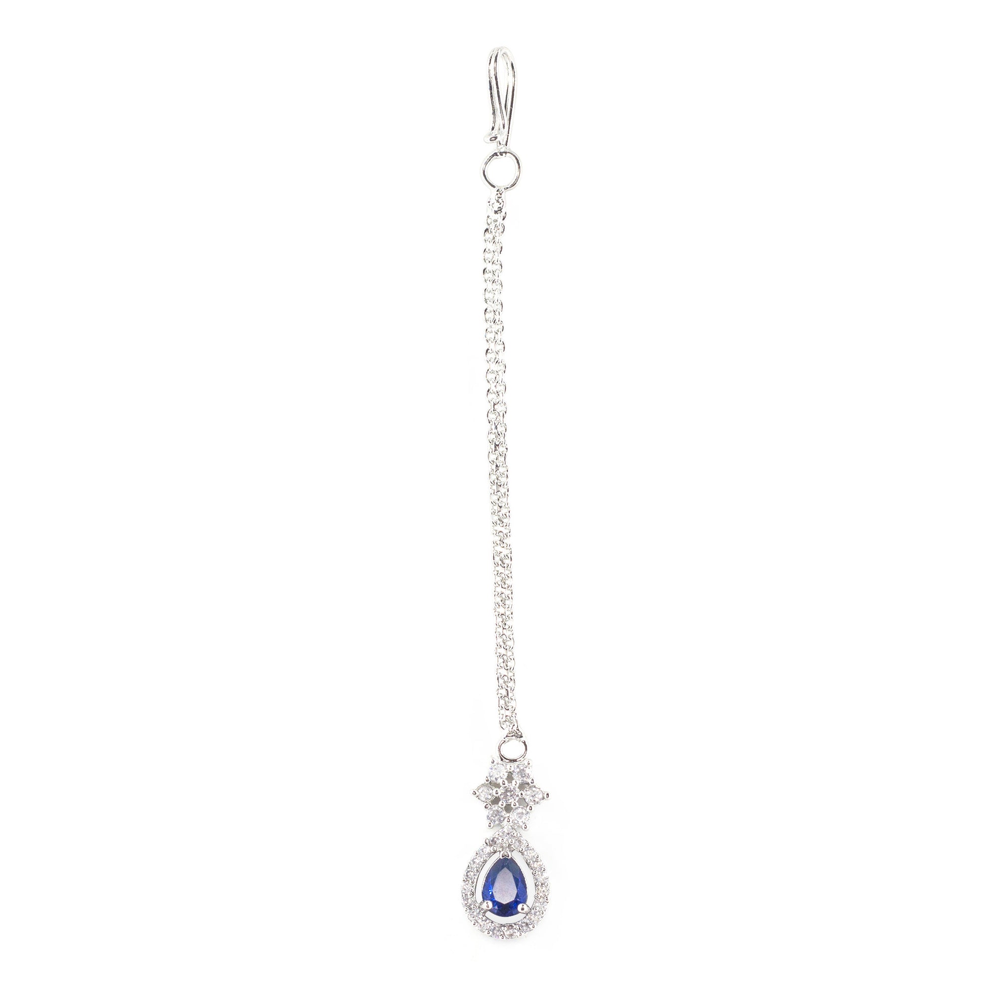 Rhodium Plated Blue AD Teardrop Maang Tikka secured with S-hook Closure.