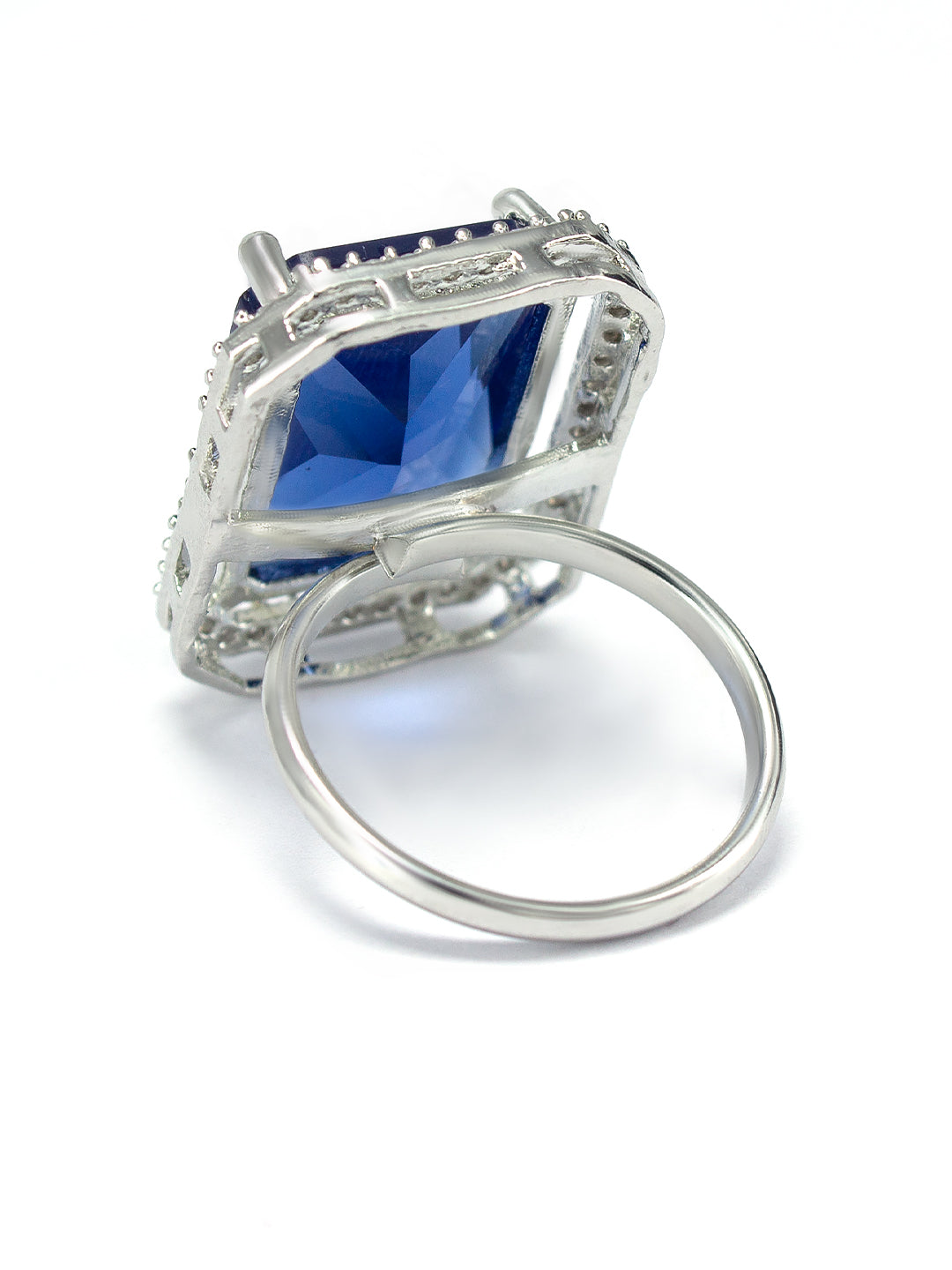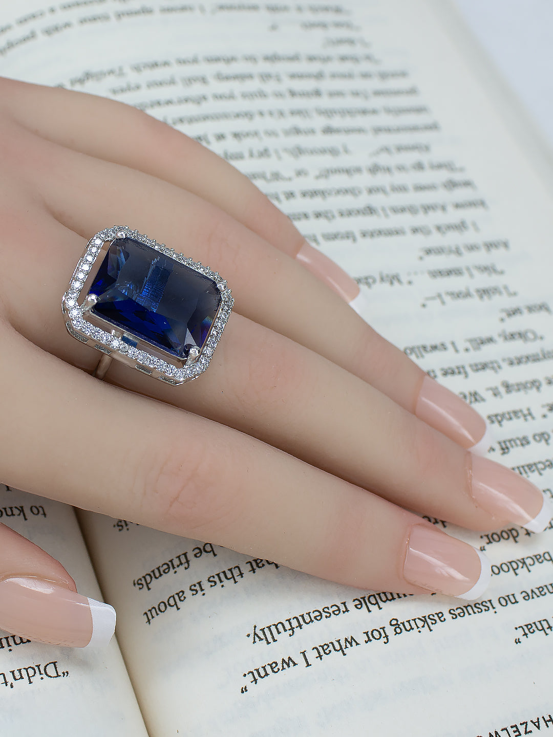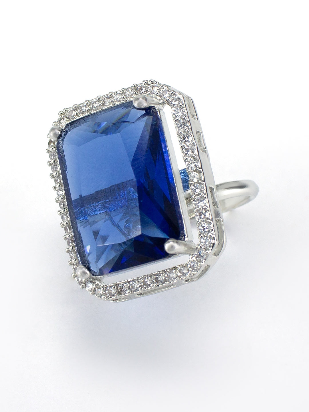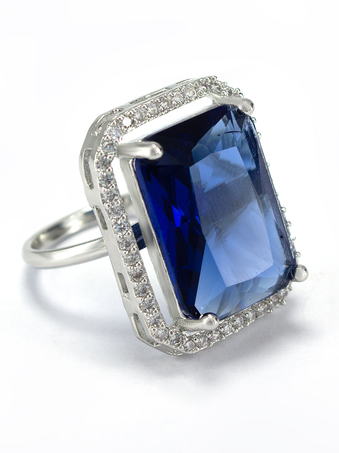 Exquisite rhodium-plated finger ring adorned with blue AD stones, crafted by a designer for timeless elegance.