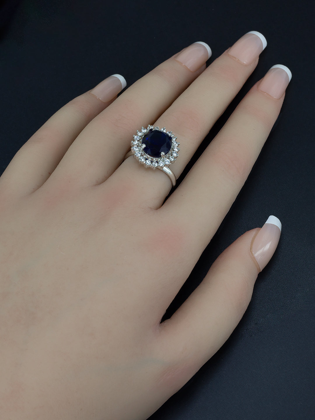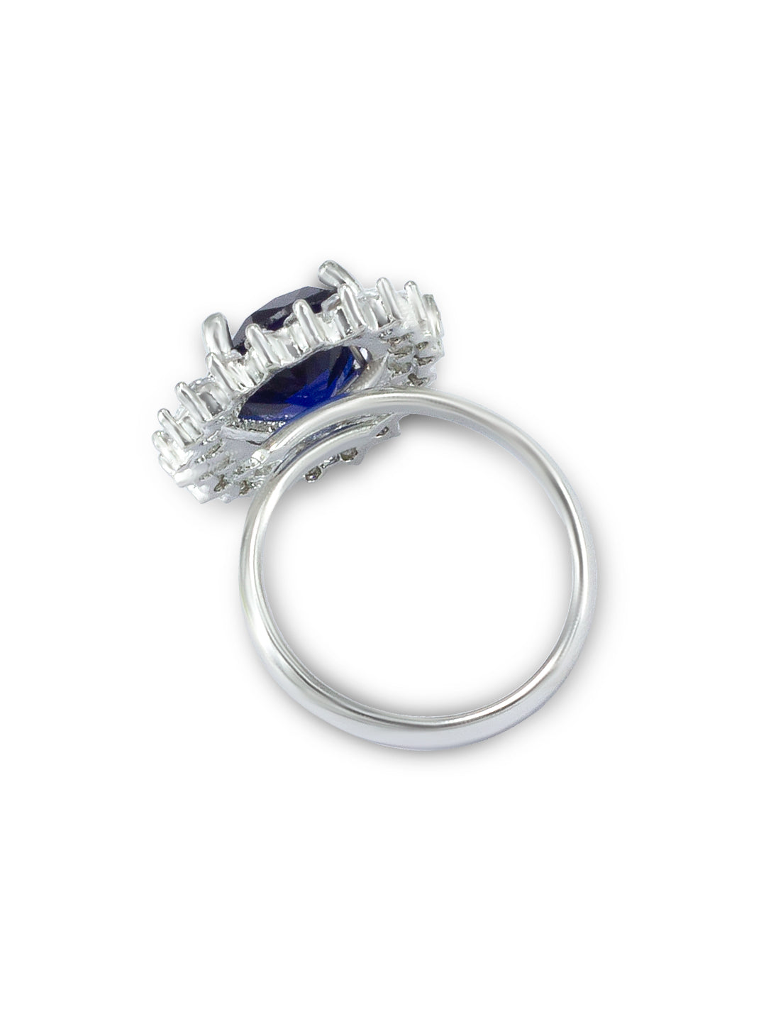 This blue American diamond finger ring is rhodium plated and features a secure slip on closure. Its adjustable design allows for a perfect fit on any finger. Elevate any outfit with the sparkle and shine of this stunning ring.