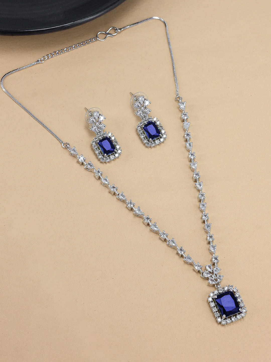 Rhodium-Plated Blue American Diamond Studded Jewellery Set