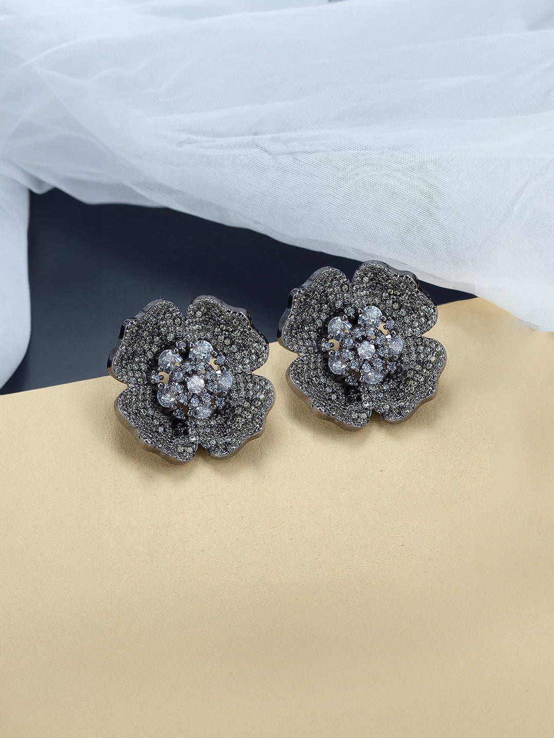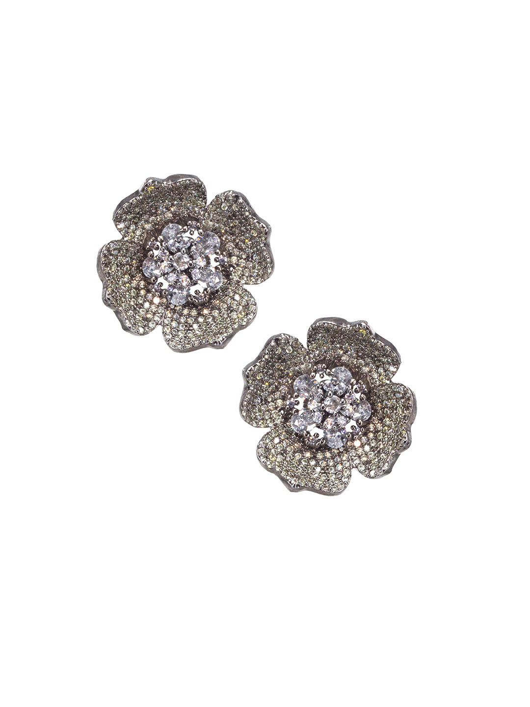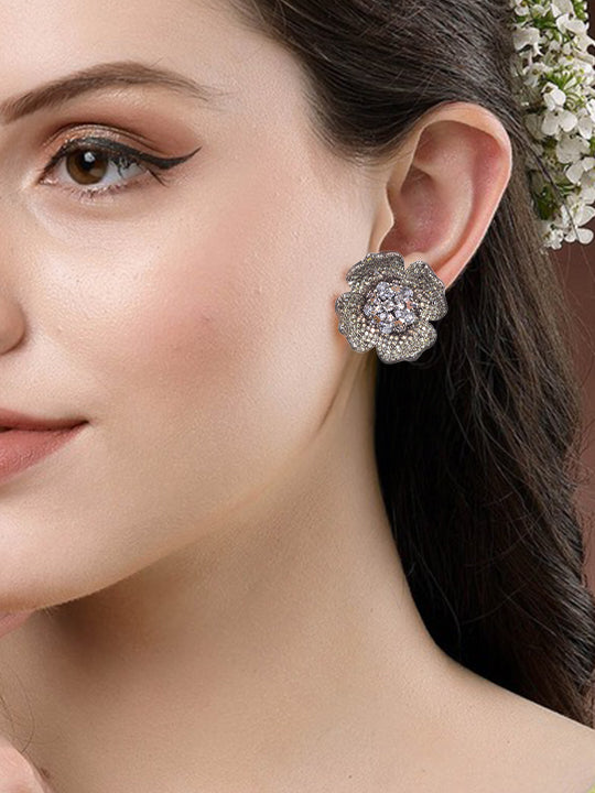 Rhodium Plated Floral American Diamond Stud Earrings