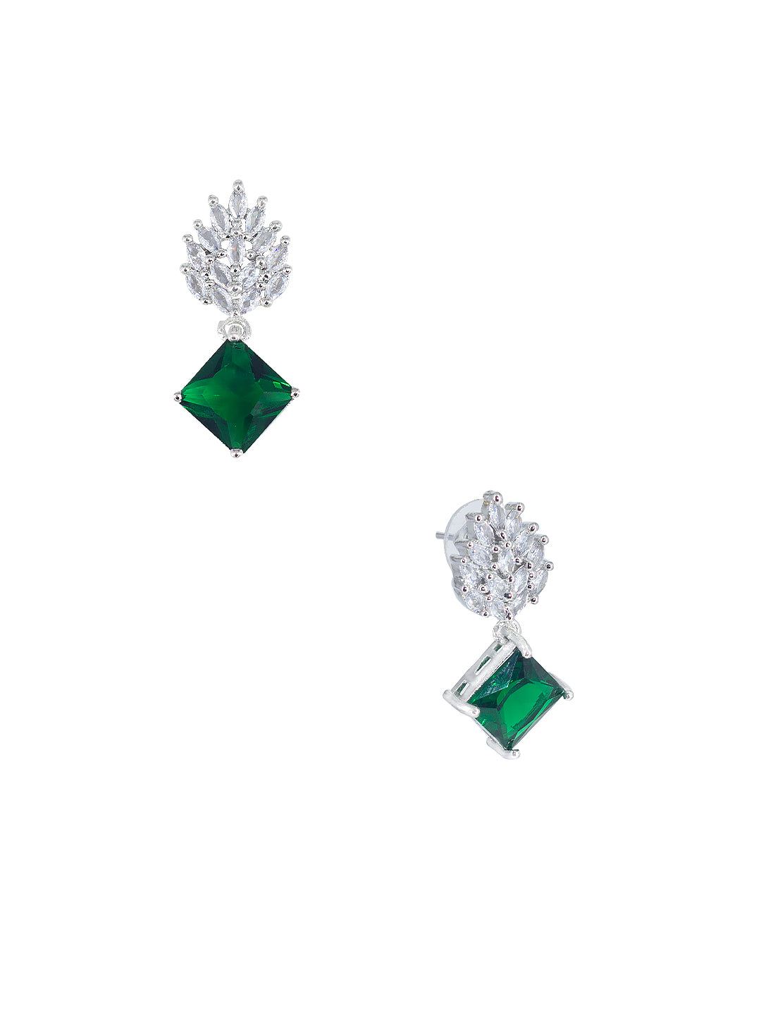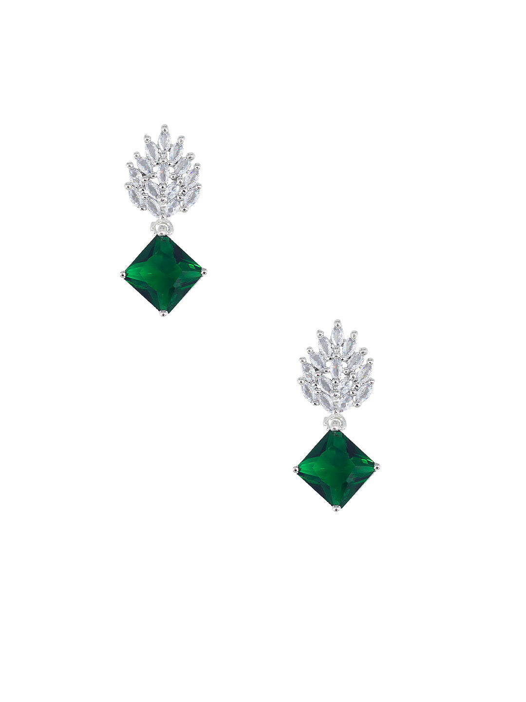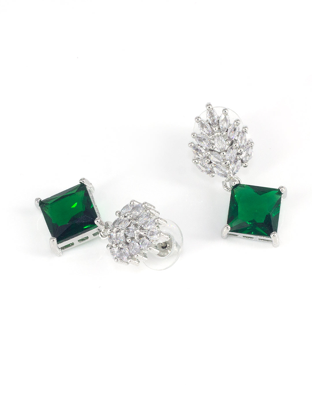These earrings are rhodium plated, has big green American Diamond studded details and secured with post and back closure.