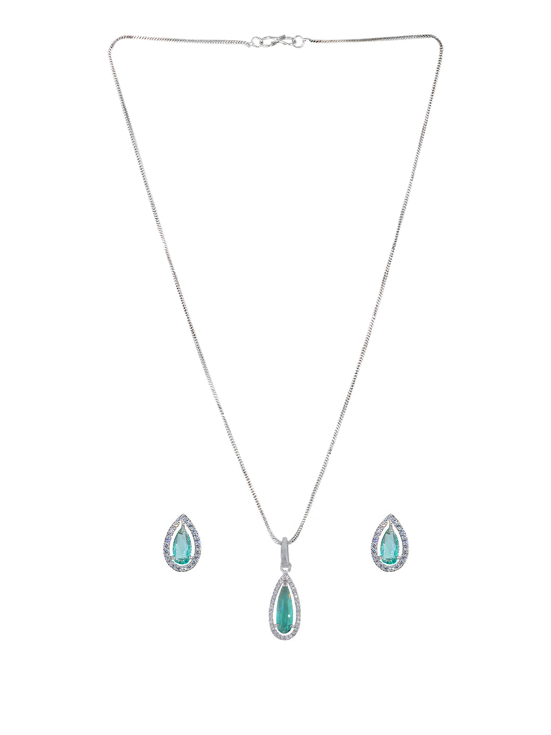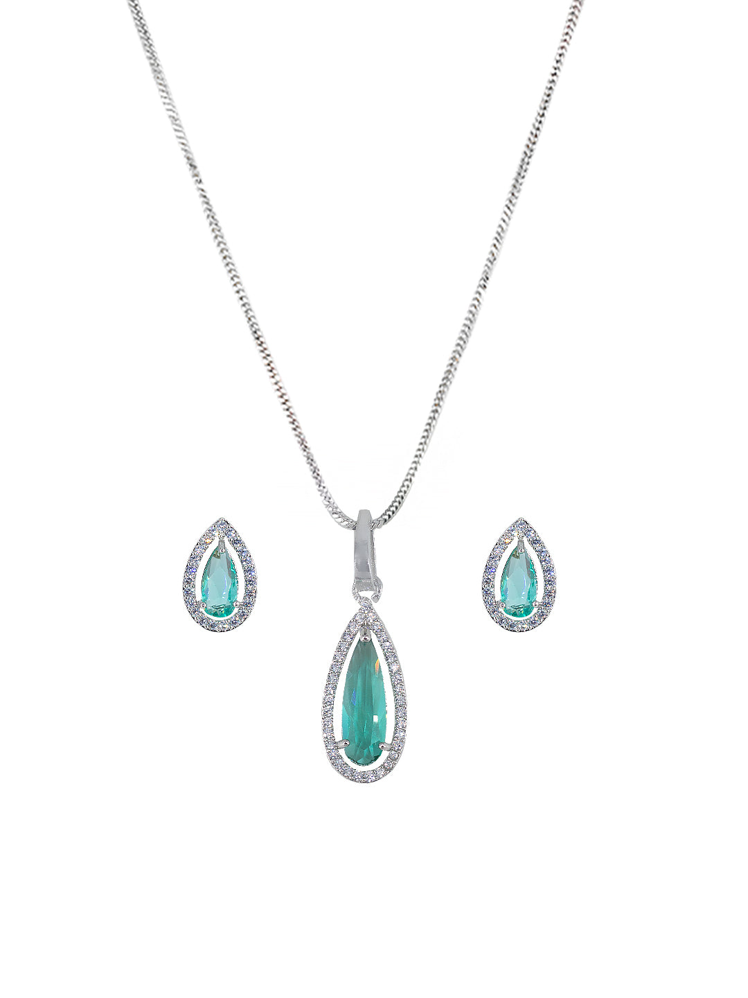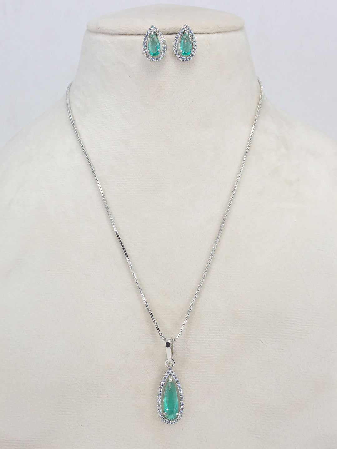 Rhodium Plated Green Drop American Diamond Trendy Pendant Set
