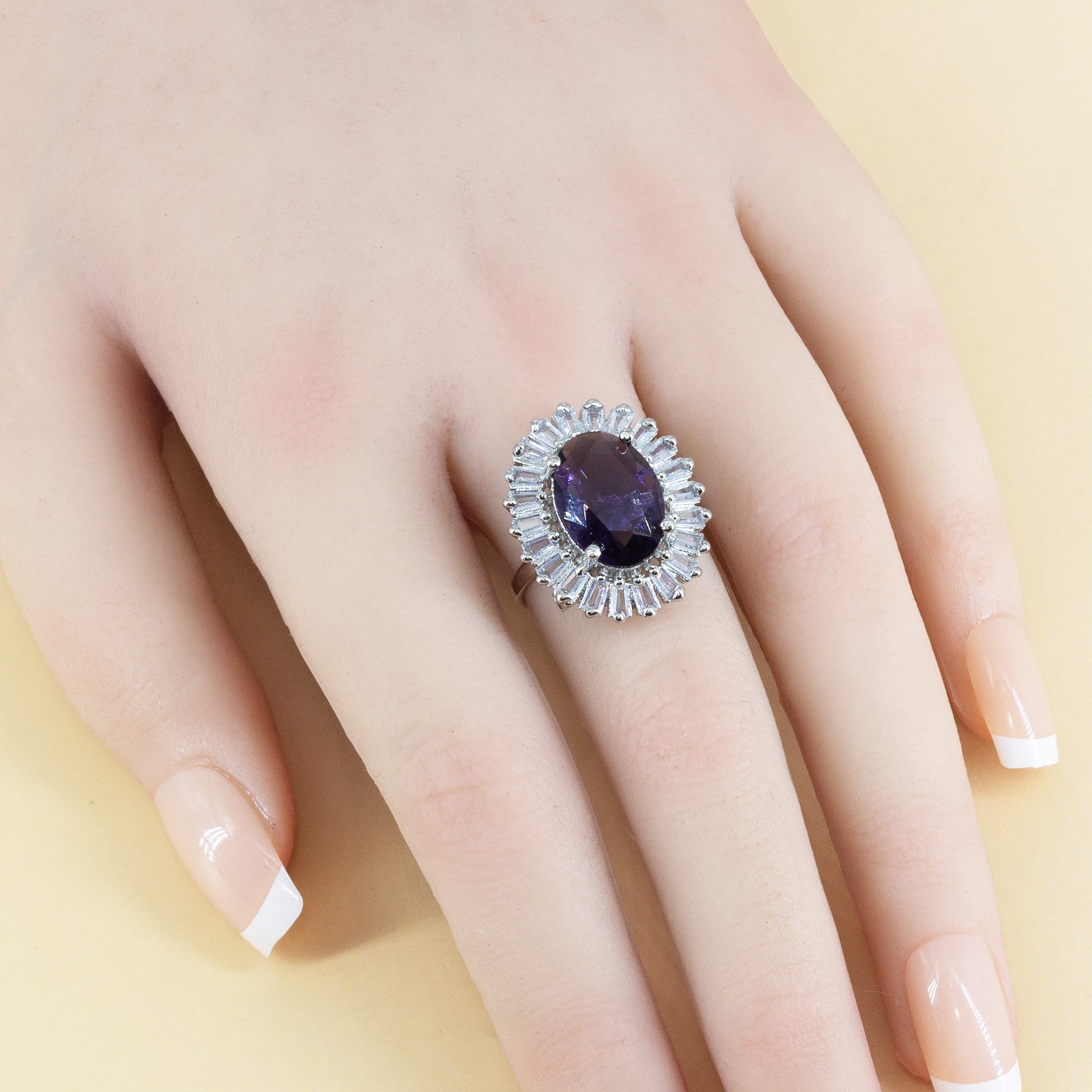 Silver Purple Stone Premium AD Ring – Rectangle-Cut with Pear Halo Design