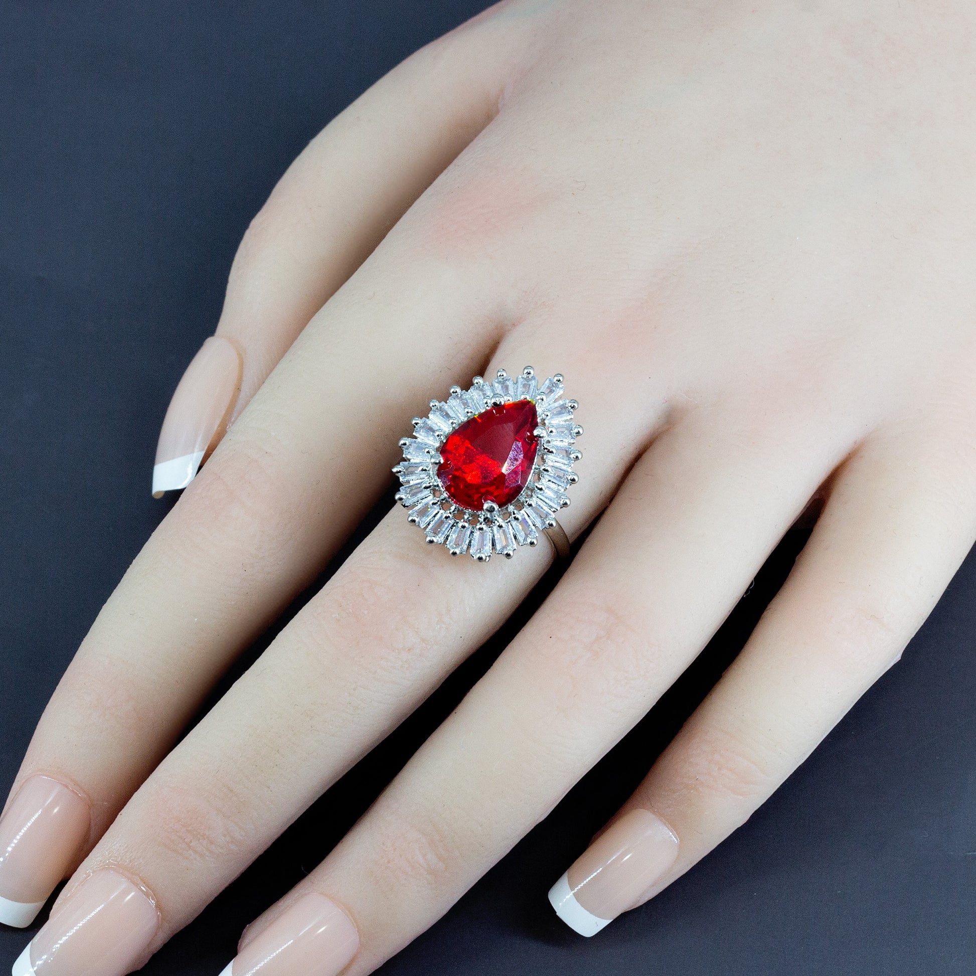 Rhodium Plated Red AD Ring for Women Secured with Adjustable Closure.