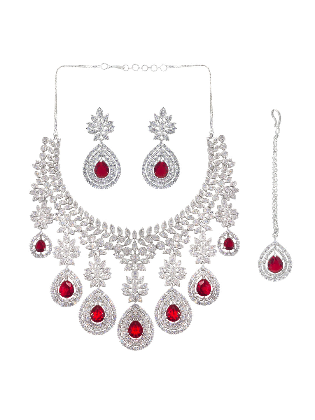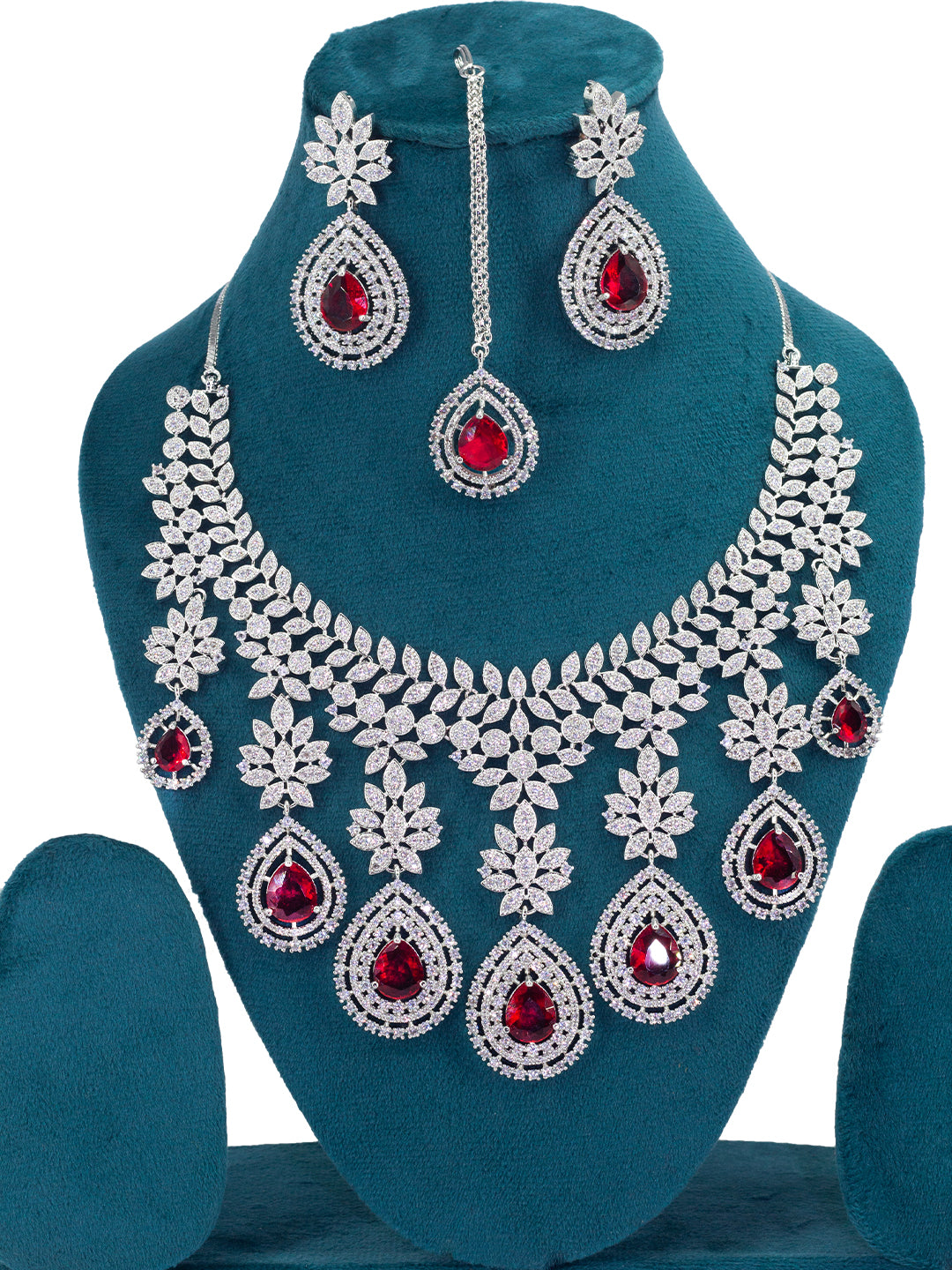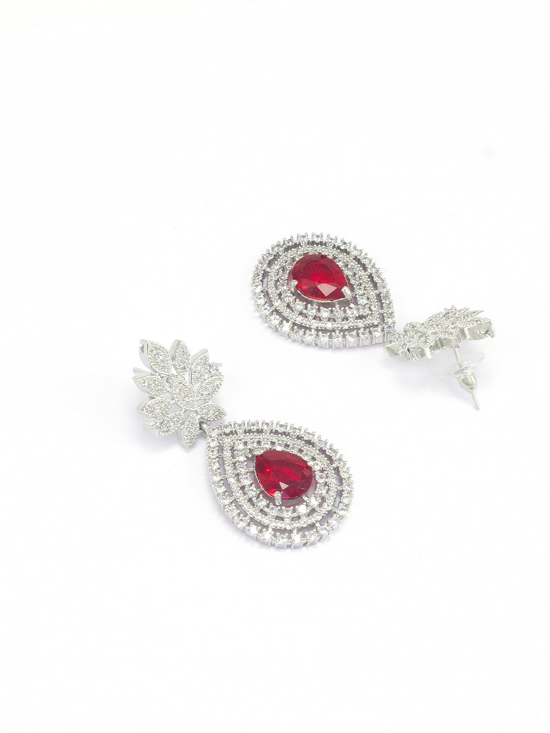 Rhodium Plated Red American Diamond Teardrop Jewellery Set