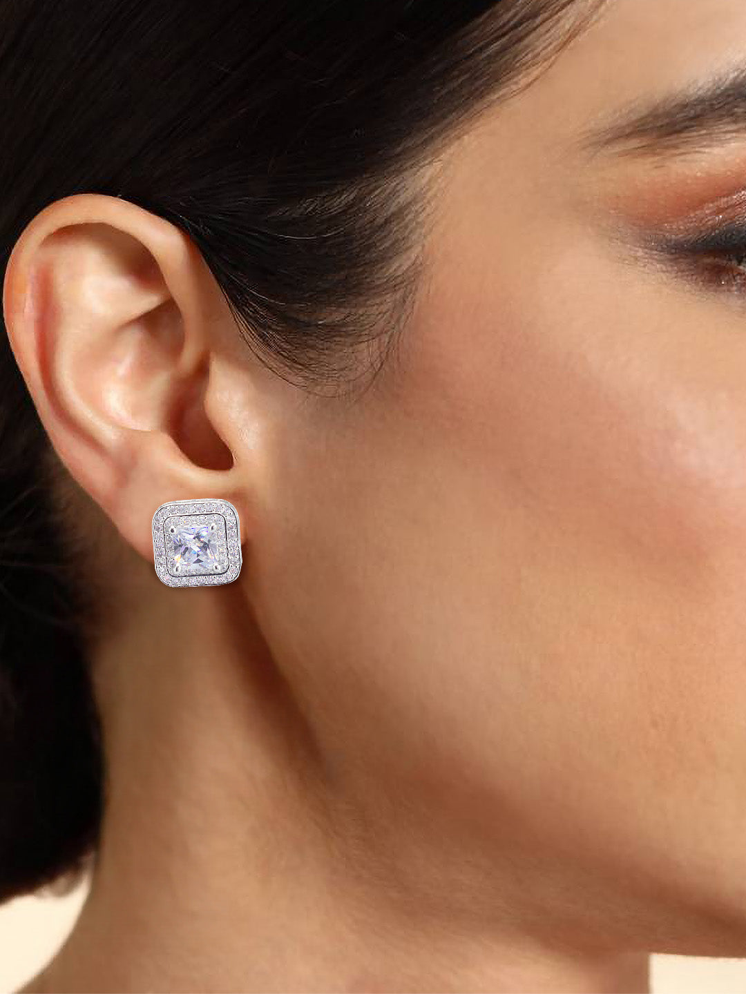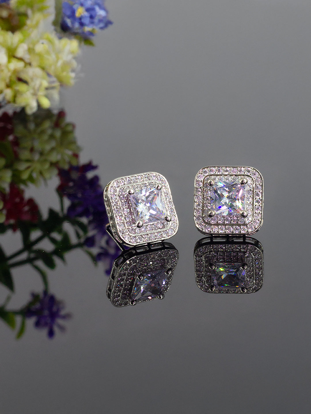 These earrings are rhodium plated, has square AD studded details and secured with post and back closure.