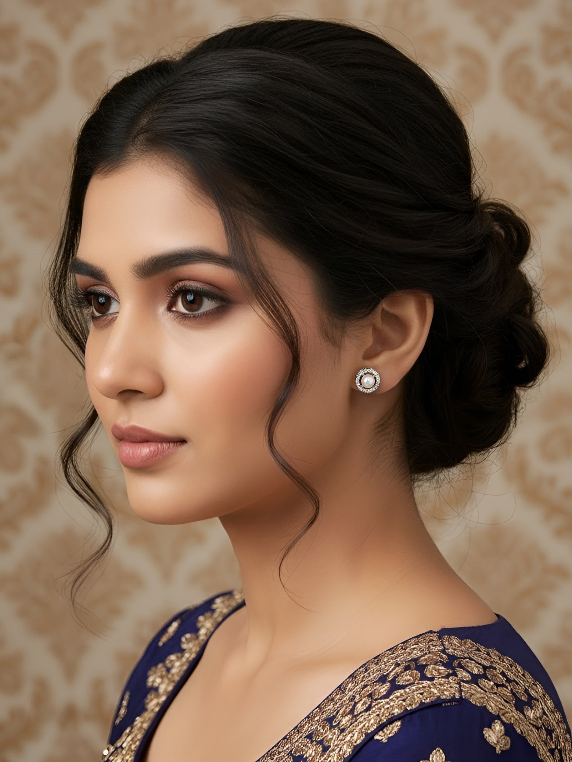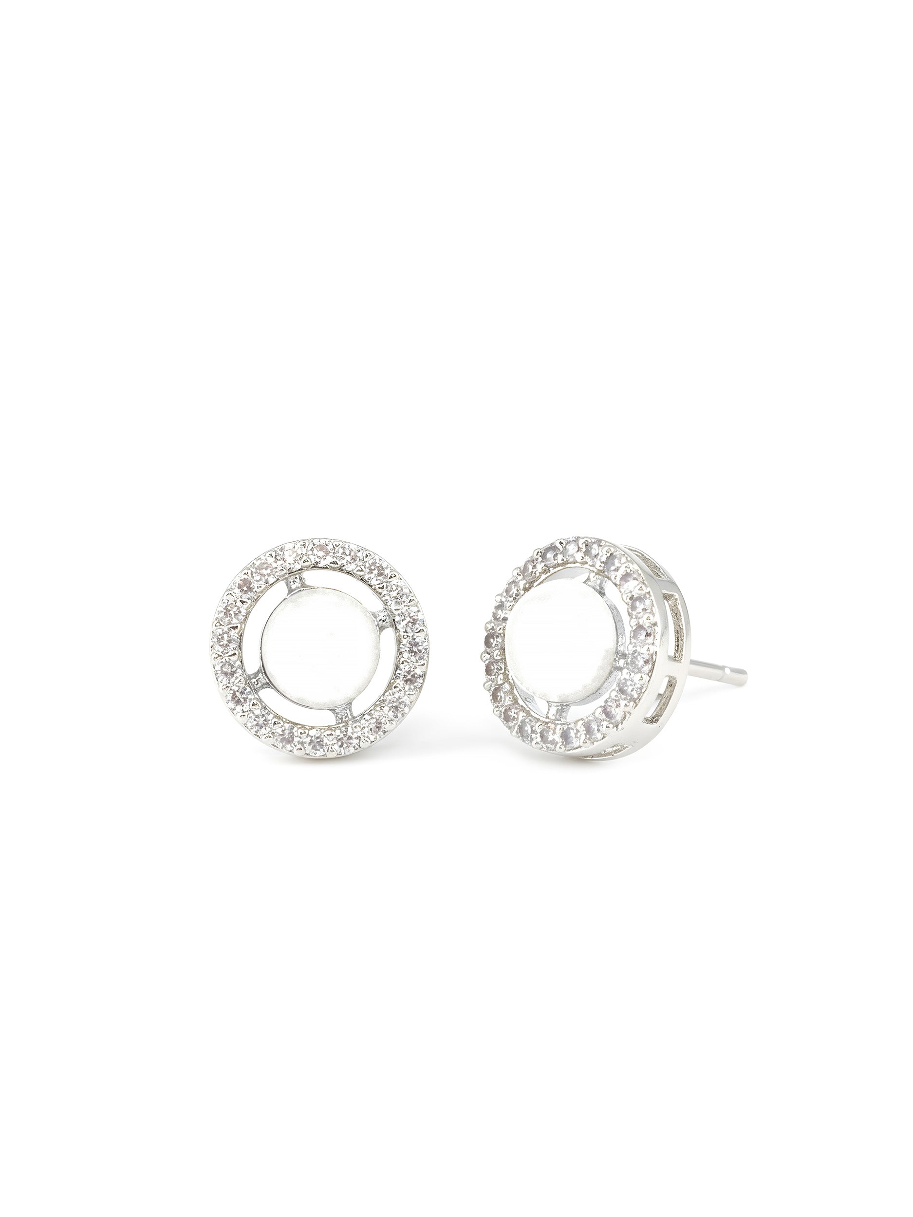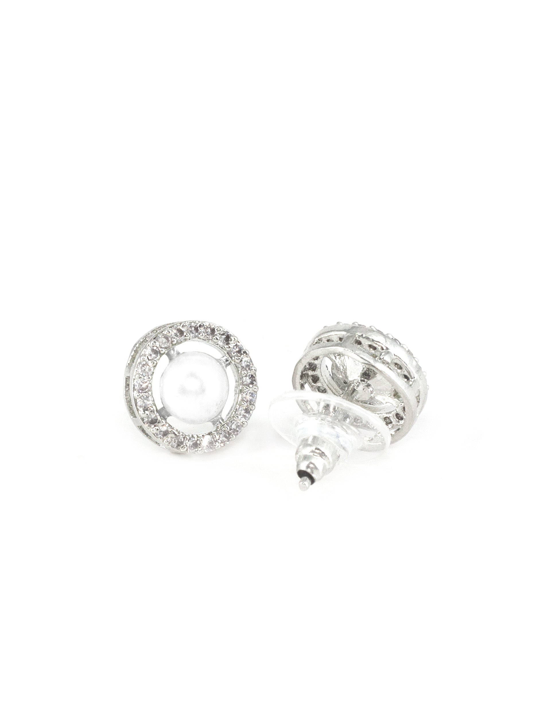 Rhodium Plated White AD & Pearl Stud Earrings for Women secured with Post & Back Closure.