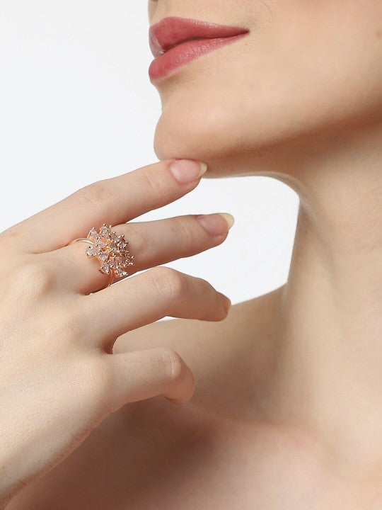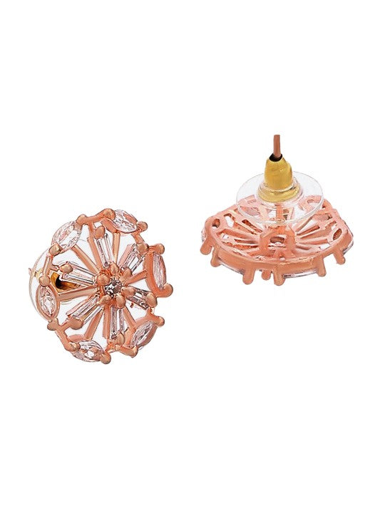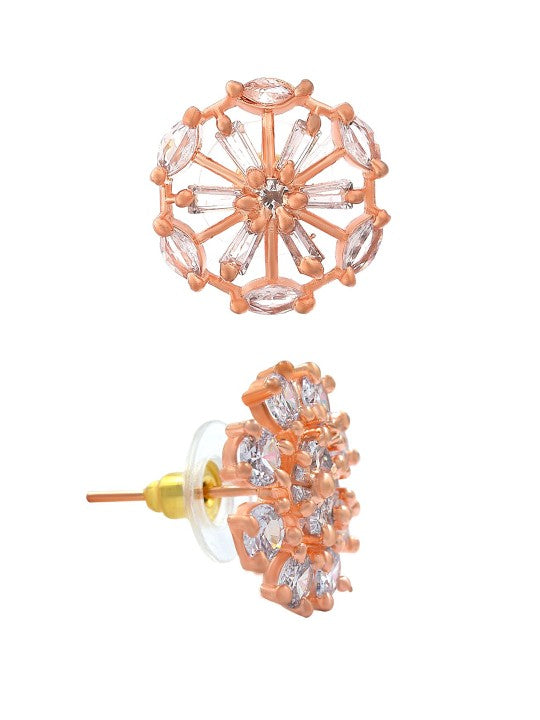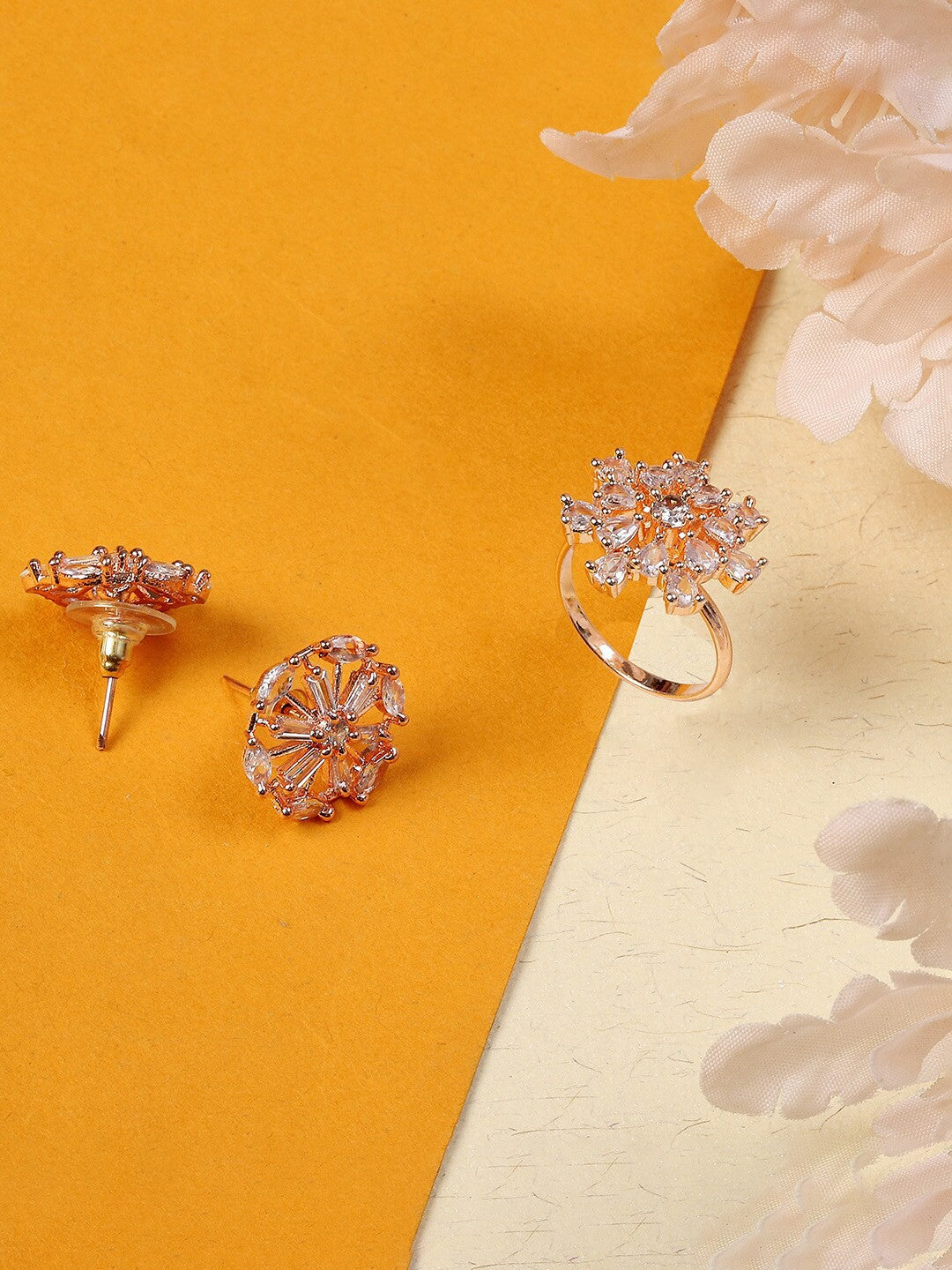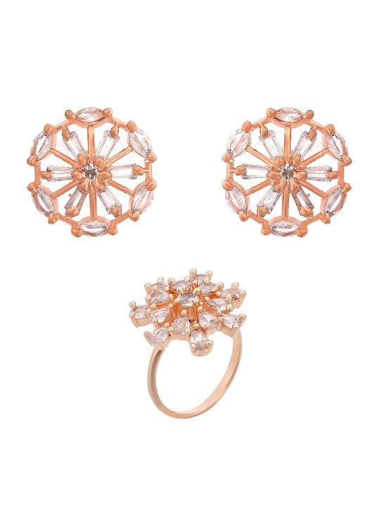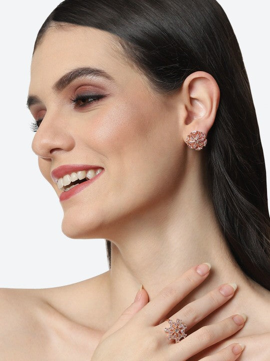 Rose Gold Plated American Diamond Earrings With Adjustable Finger Ring
