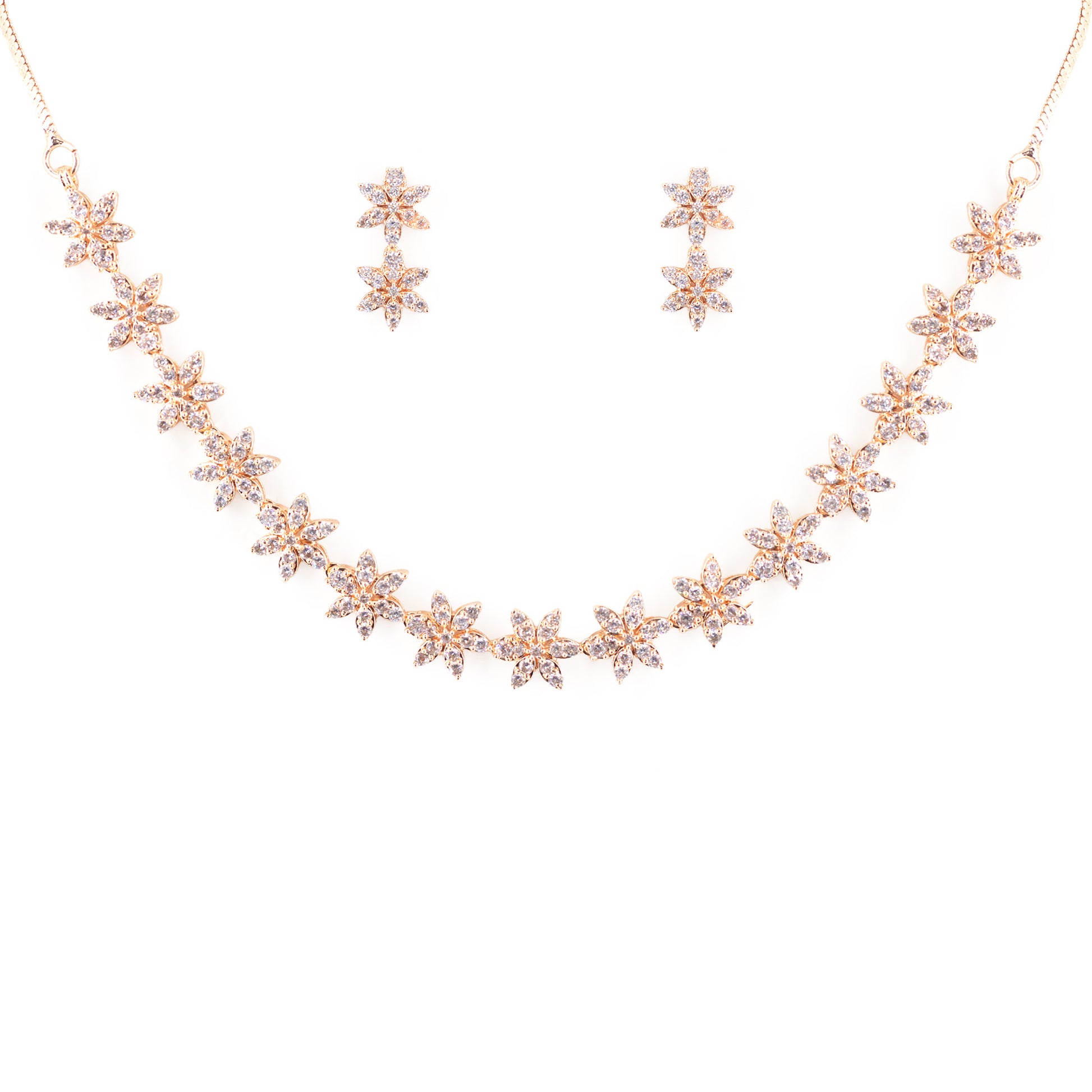 Rose Gold Plated American Diamond Floral choker Jewellery Set for Women secured with S-Hook closure and Earrings with Post & Back Closure.