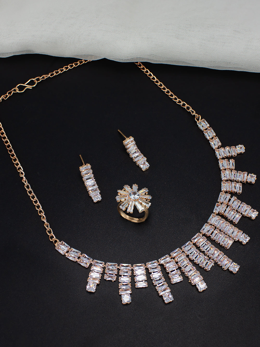 Rose Gold Plated Cubic Zirconia Studded Jewellery Set With Adjustable Ring