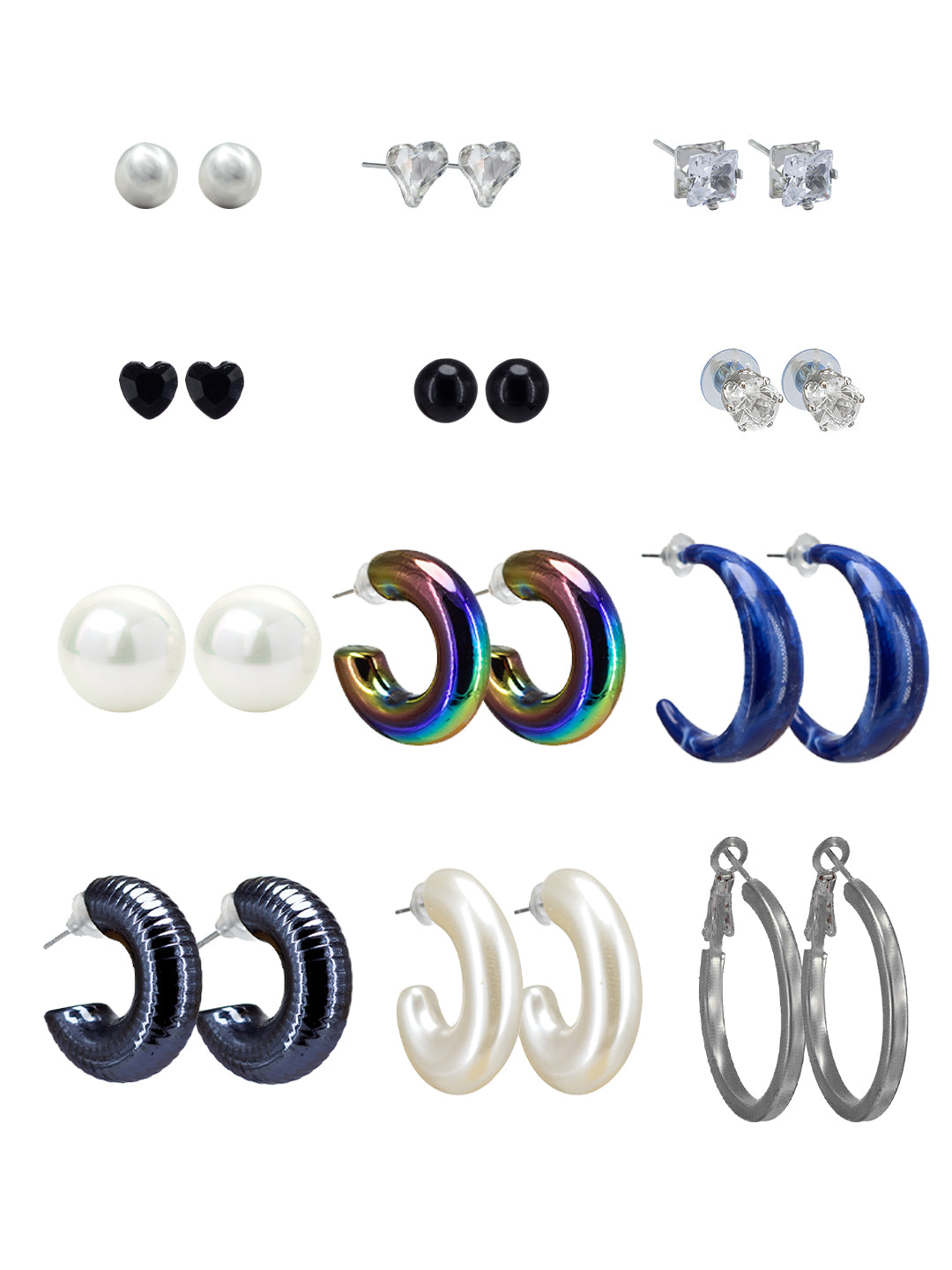 Enhance your style with this set of 12 multi color earrings. The set includes a variety of hoop, dangle, and stud designs, perfect for any occasion. Add a touch of elegance and versatility to your jewelry collection.