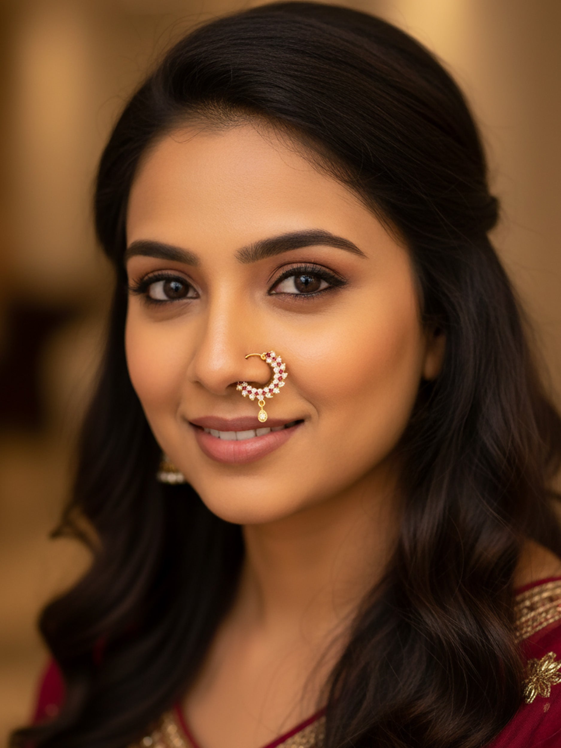 Gold & Silver Plated Red & White American Diamond Studded Nose Ring Secured with Insert Closure.