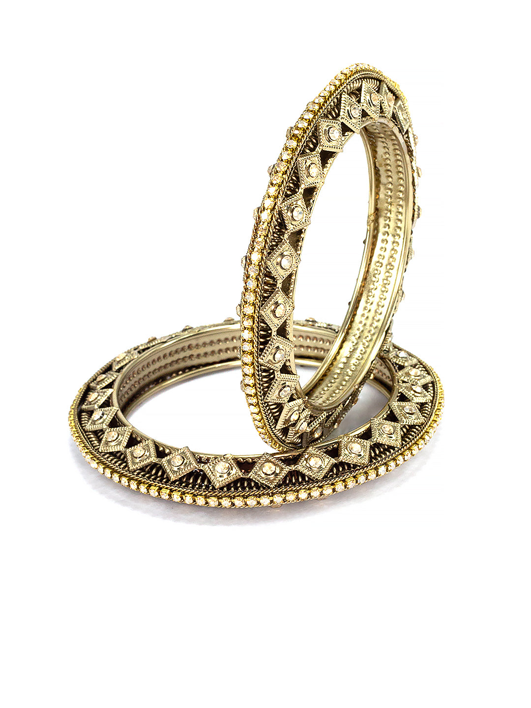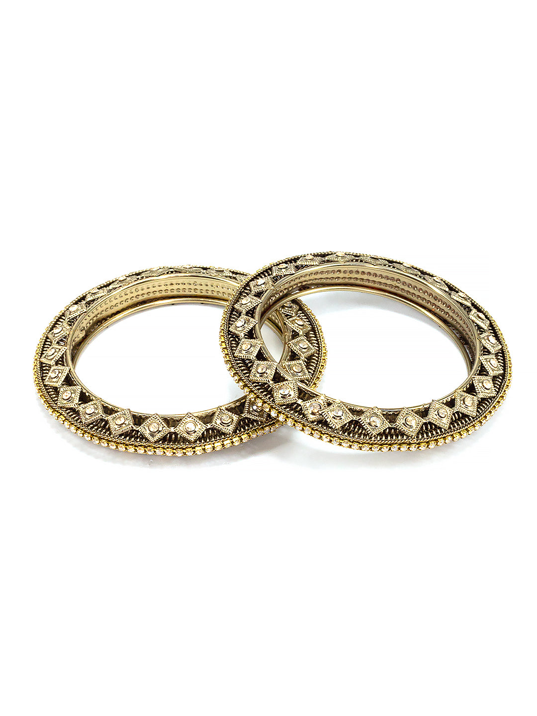 Add a touch of elegance to your style with these stunning Set Of 2 Brass-Plated Stone-Studded Antique Bangles. Made with high-quality brass and adorned with intricate stone detailing, these bangles are a must-have accessory for any occasion. Elevate your outfit and make a statement with these beautiful bangles.