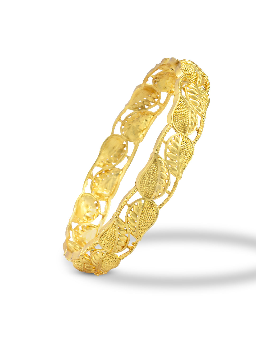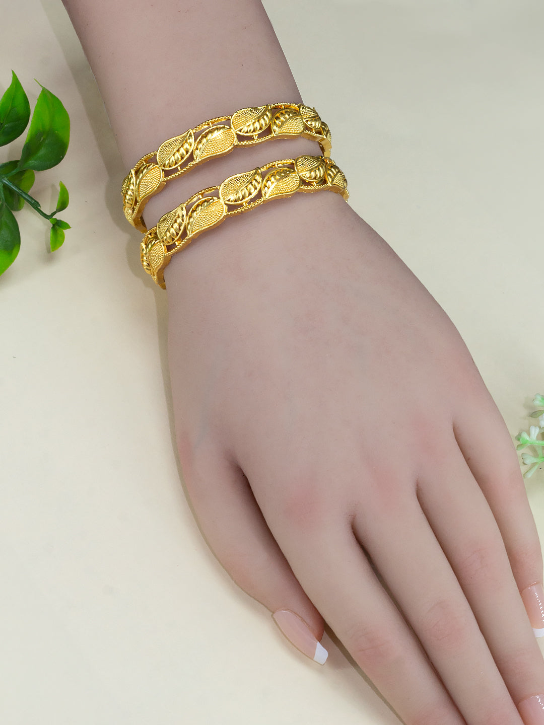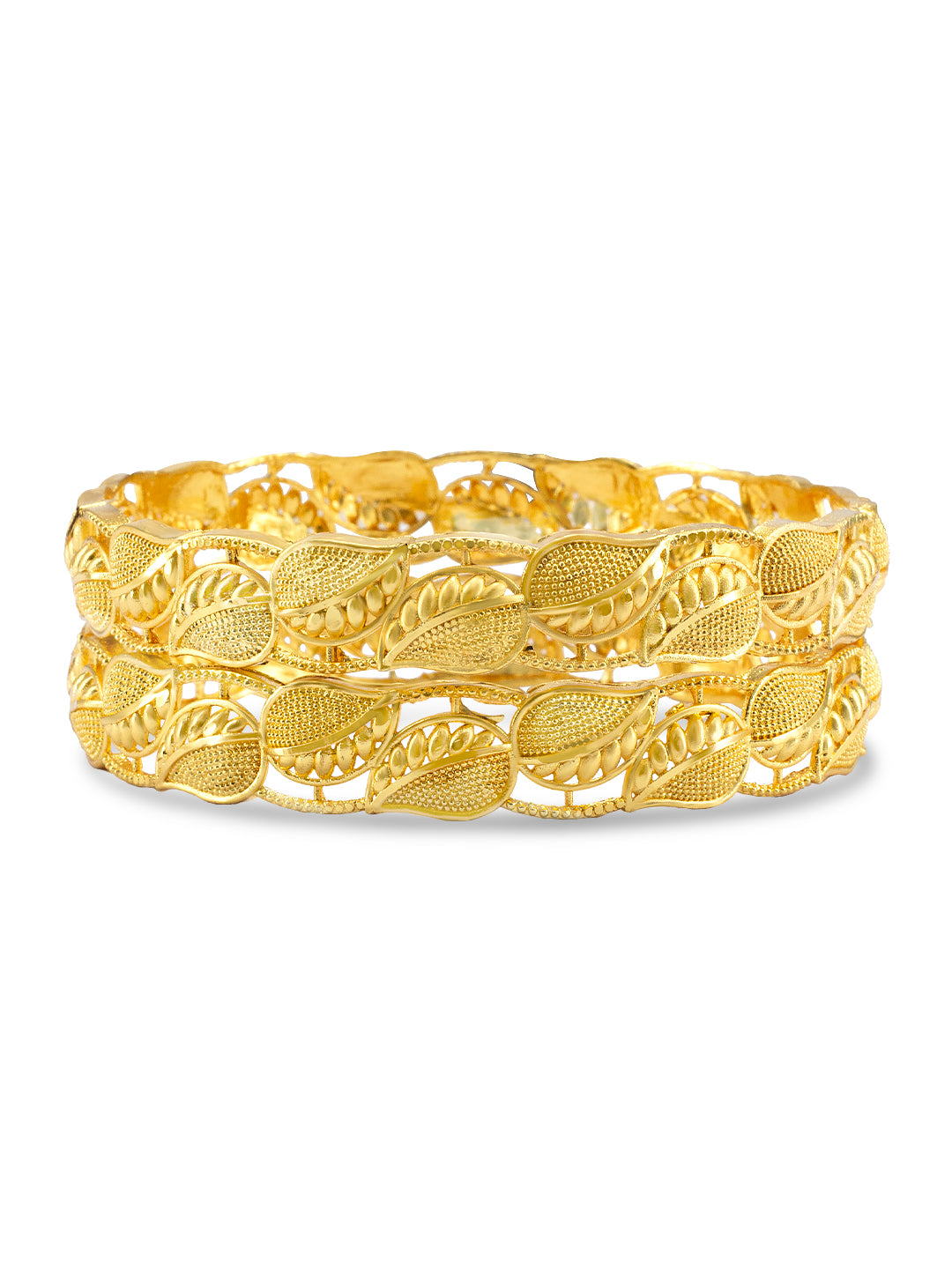 These beautifully crafted bangles feature a unique leaf design and are plated in gold for a luxurious look. Enhance your style with these eye-catching accessories.