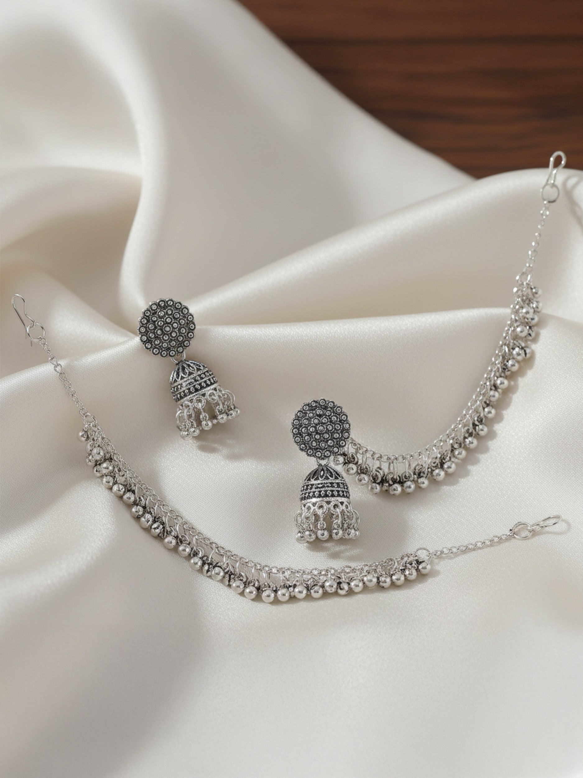 Silver Oxidised Earrings secured with Post & Back closure and Chain with S-Hook closure.
