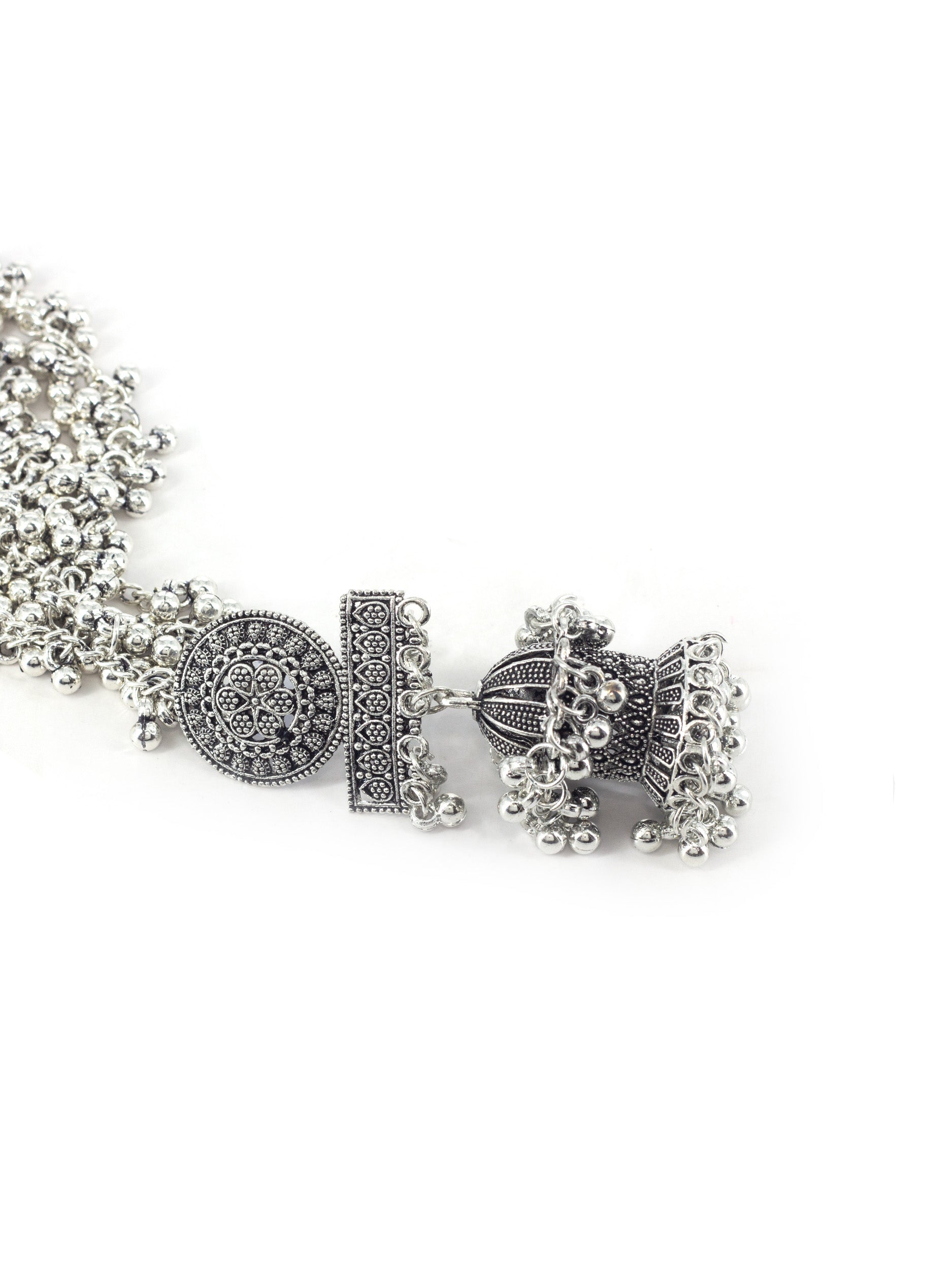 Silver Oxidised Double Jhumka Earrings with Ear Chain secured with Post & Back Closure and Chain with S-Hook Closure.