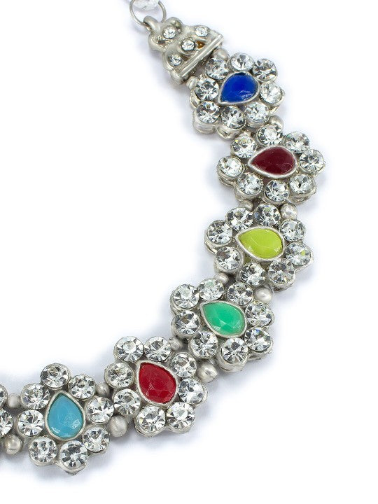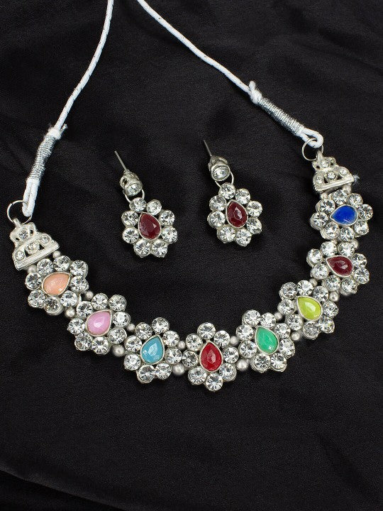 Silver Oxidised Multi Color Stone Studded Floral Jewellery Set