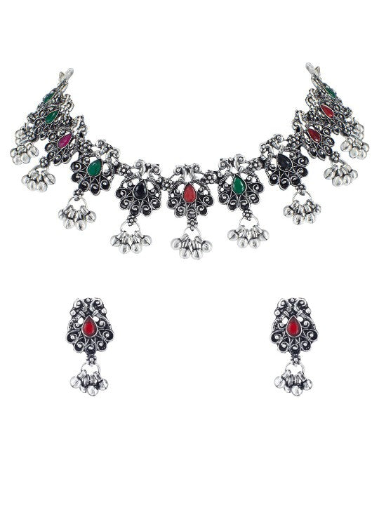 Silver-Oxidised Peacock & Floral Stone-Studded Jewellery Set