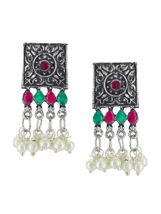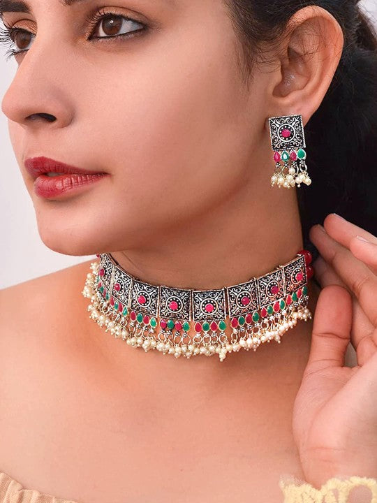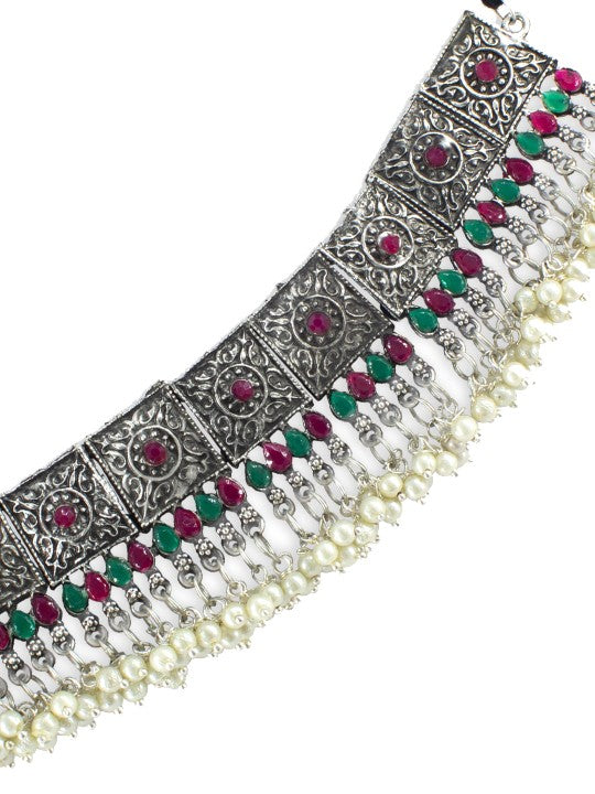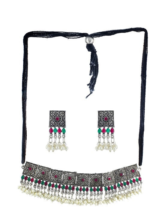 Silver Oxidised Stone Studded & Beaded Jewellery Set