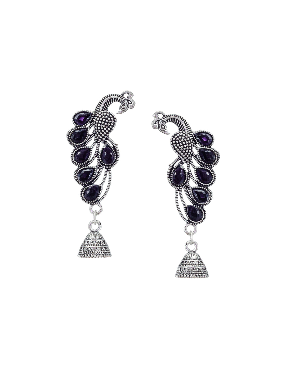 These drop earrings are silver oxidized, has peacock motif and artificial stones studded details and secured with post and back closure.
