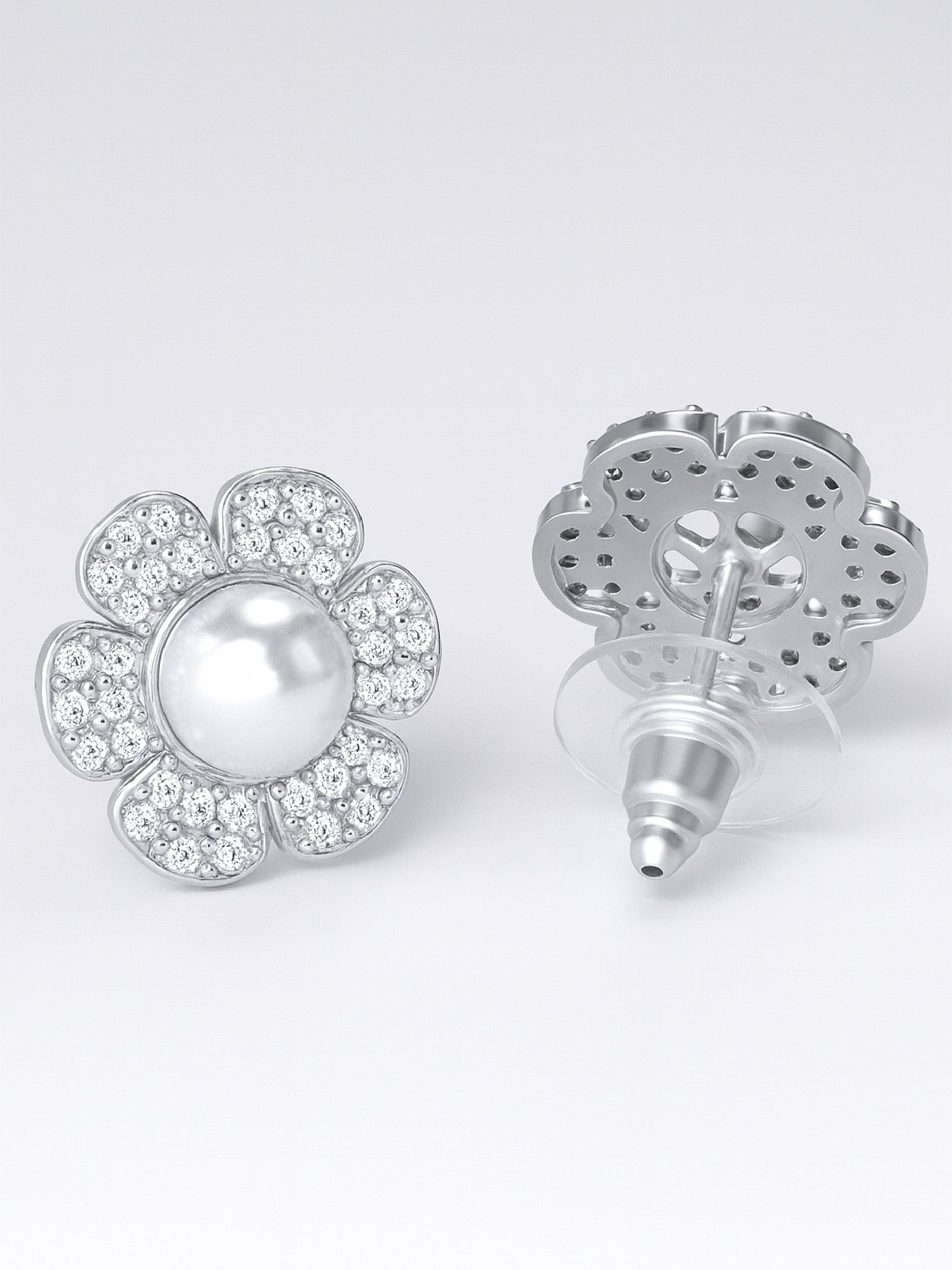 Silver Plated American Diamond with Faux Pearl Studded Floral Stud Earrings with Post & Back Closure.