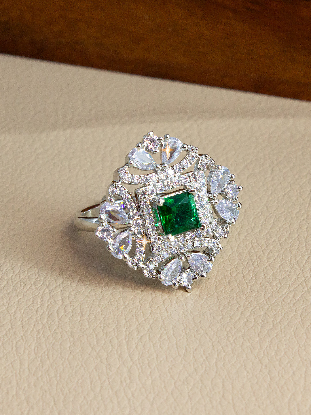 Silver-plated adjustable finger ring, has green & white ad stone-studded and floral shaped details.