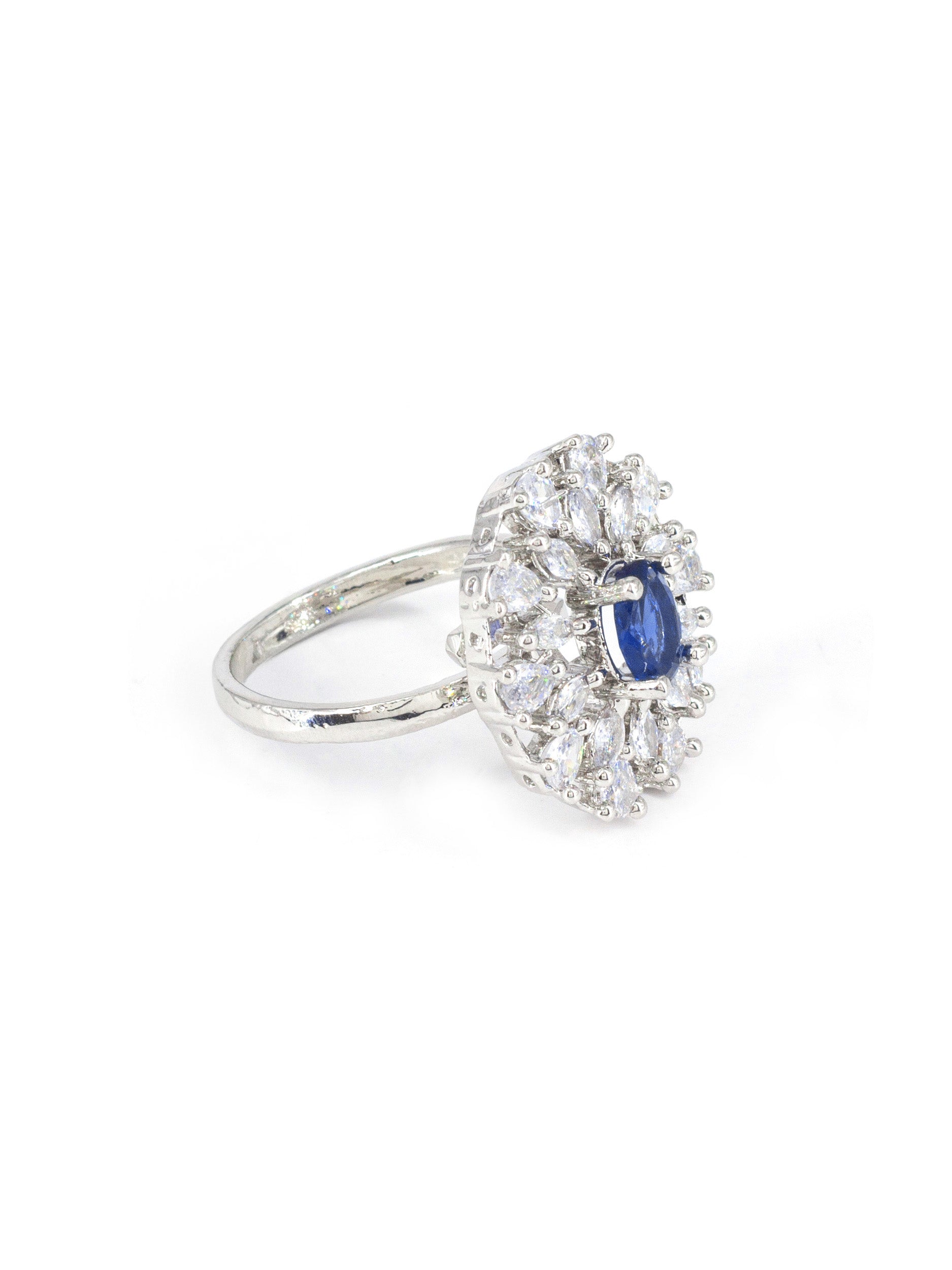 Silver Plated Blue AD Floral Adjustable Ring for Women