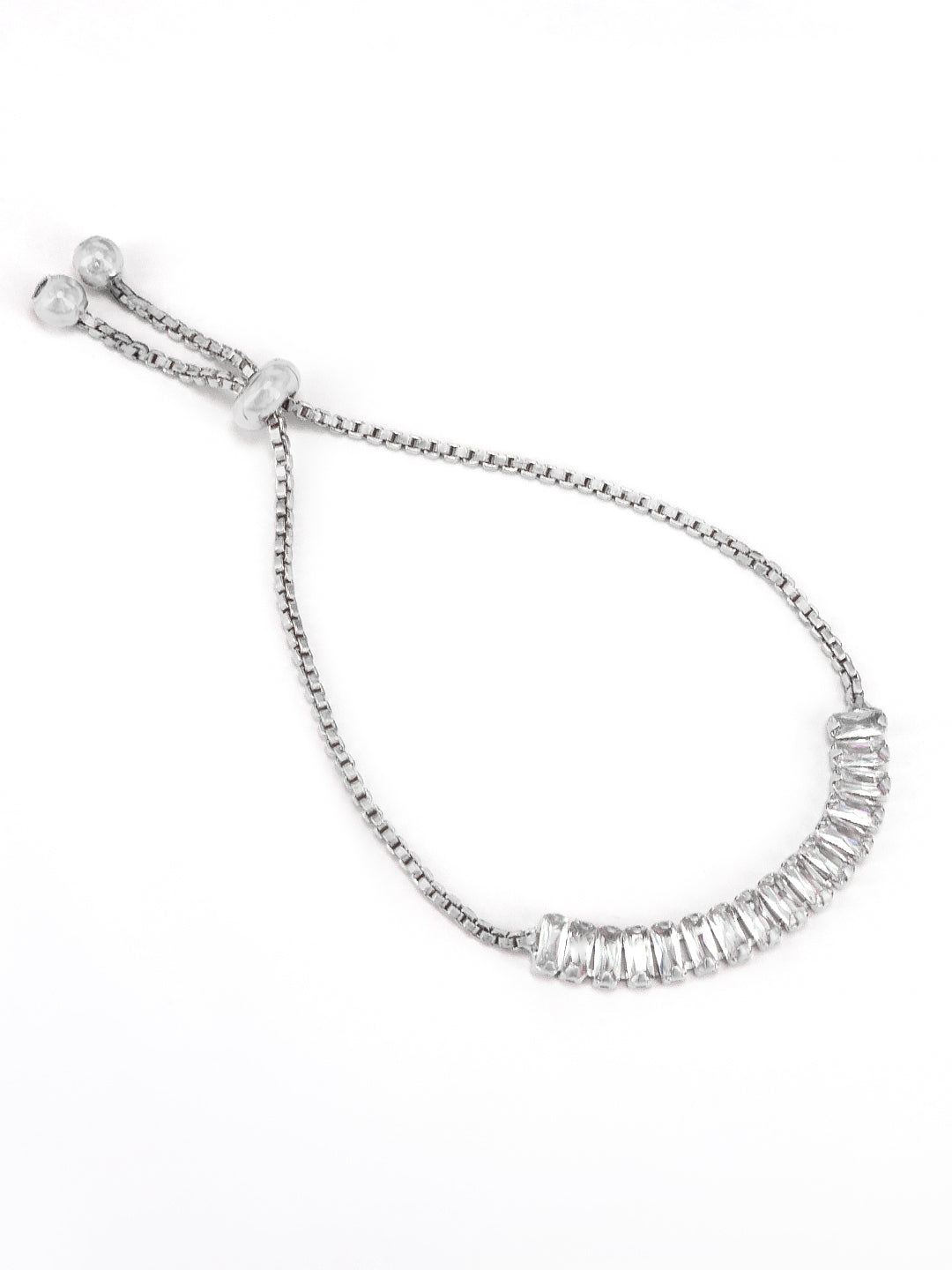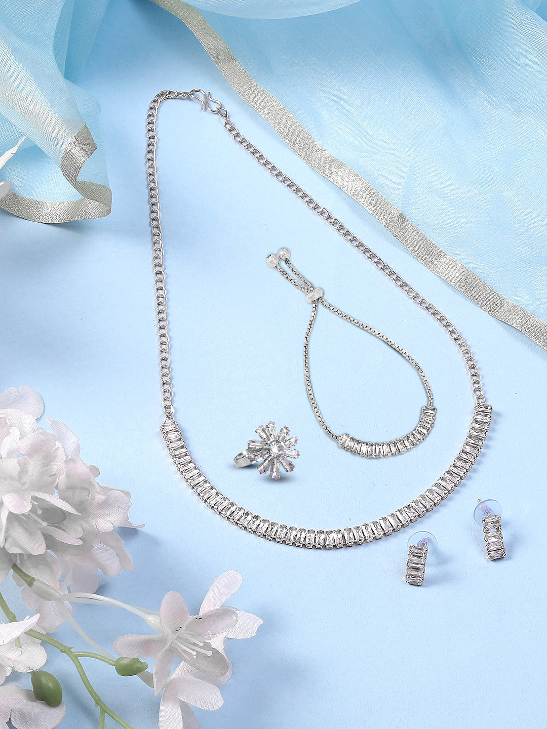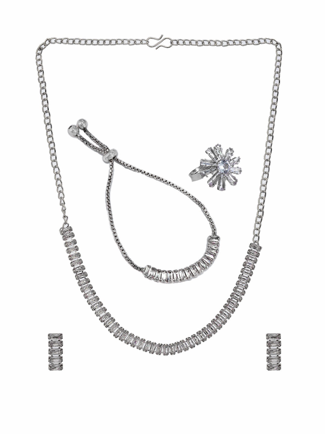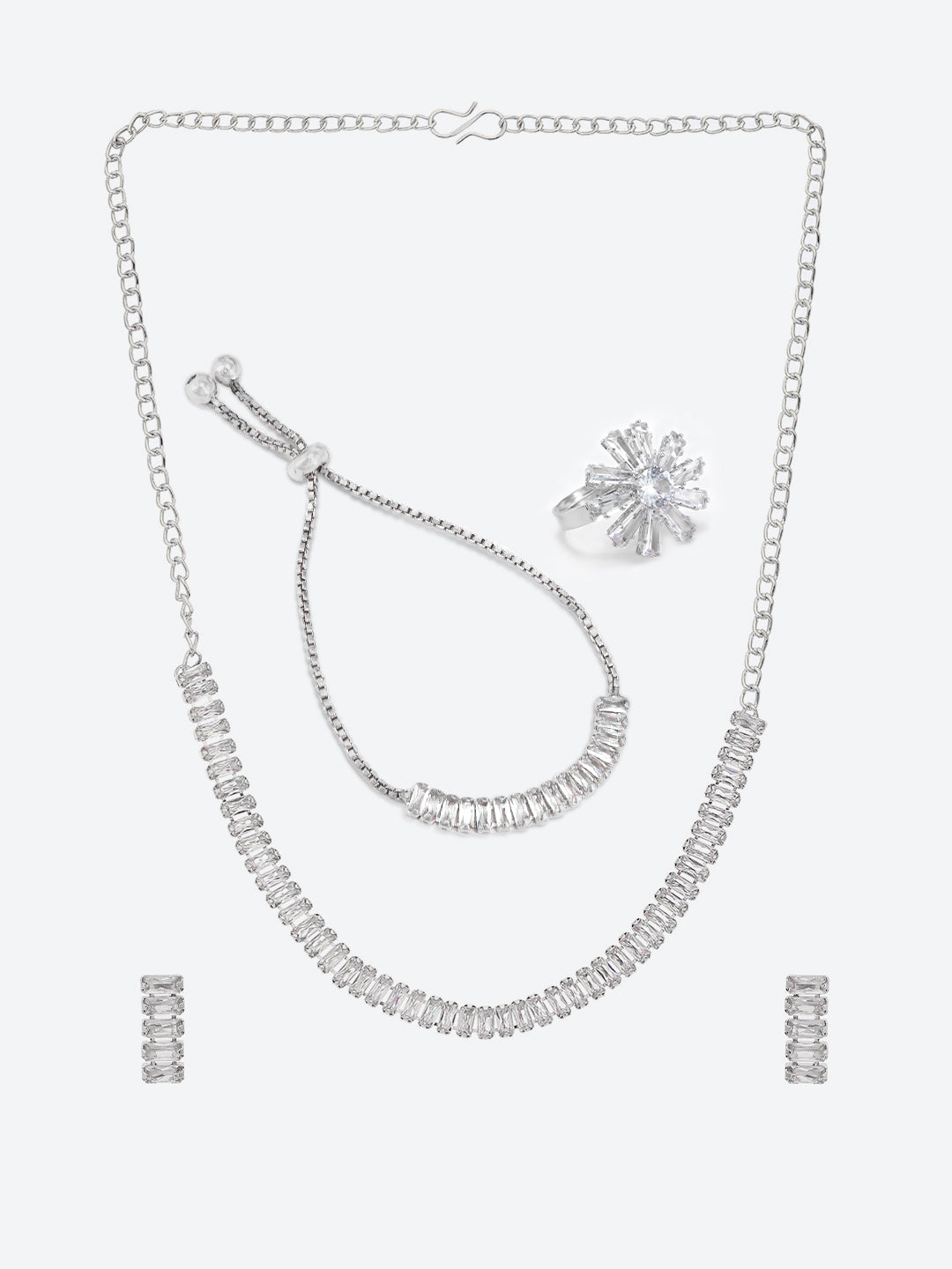 Silver Plated Cubic Zirconia Studded Jewellery Set With Adjustable Ring & Bracelet