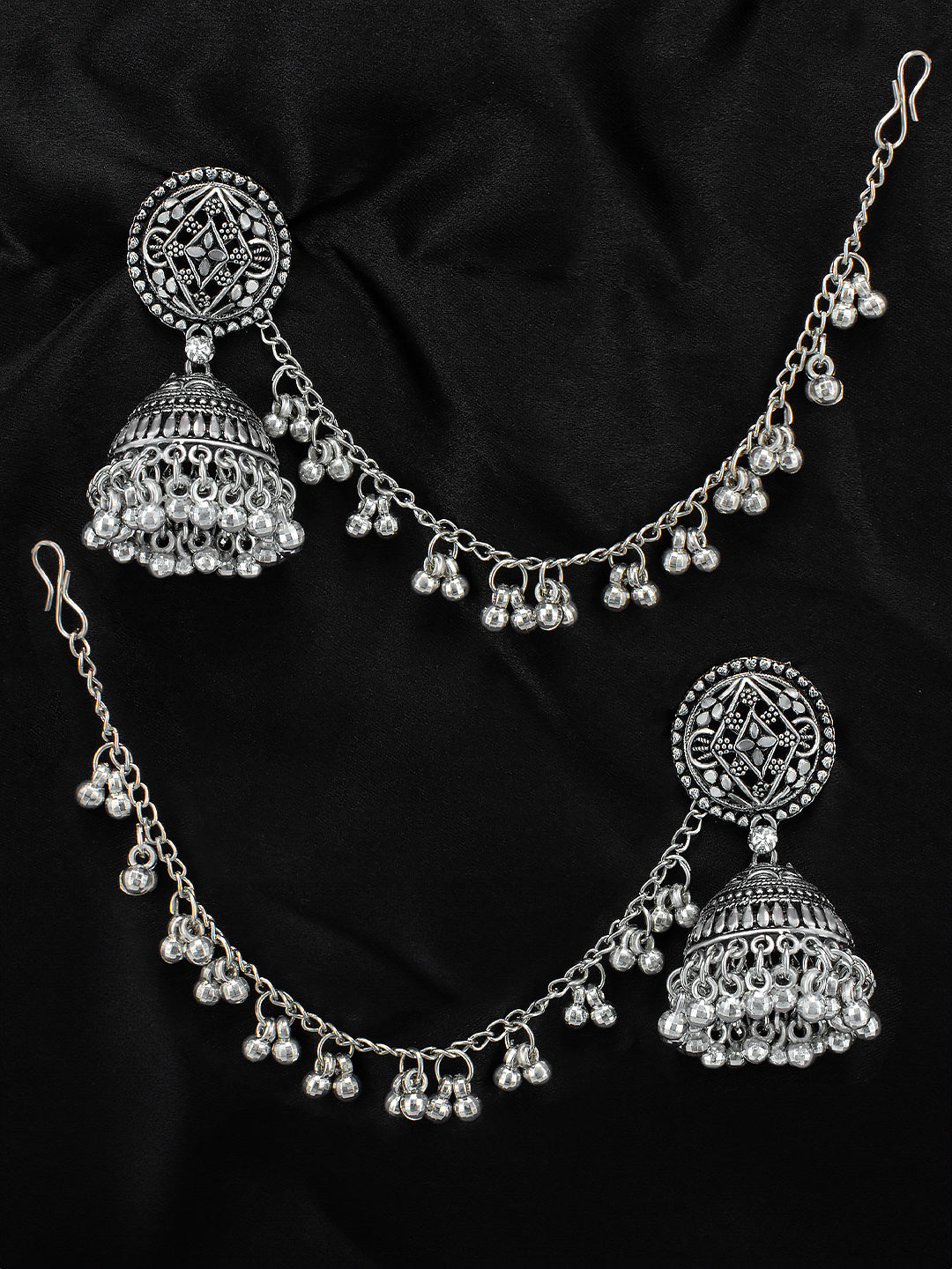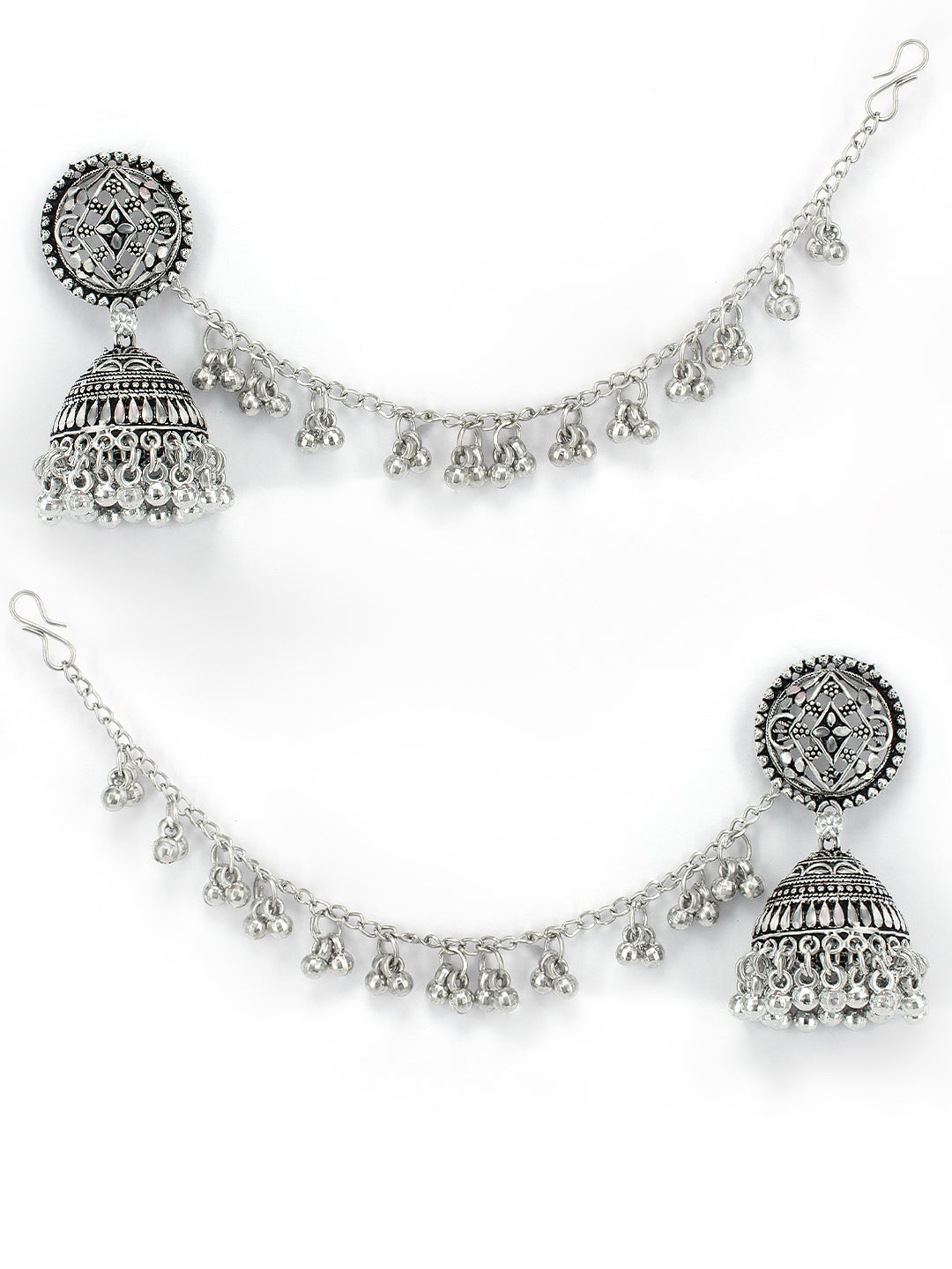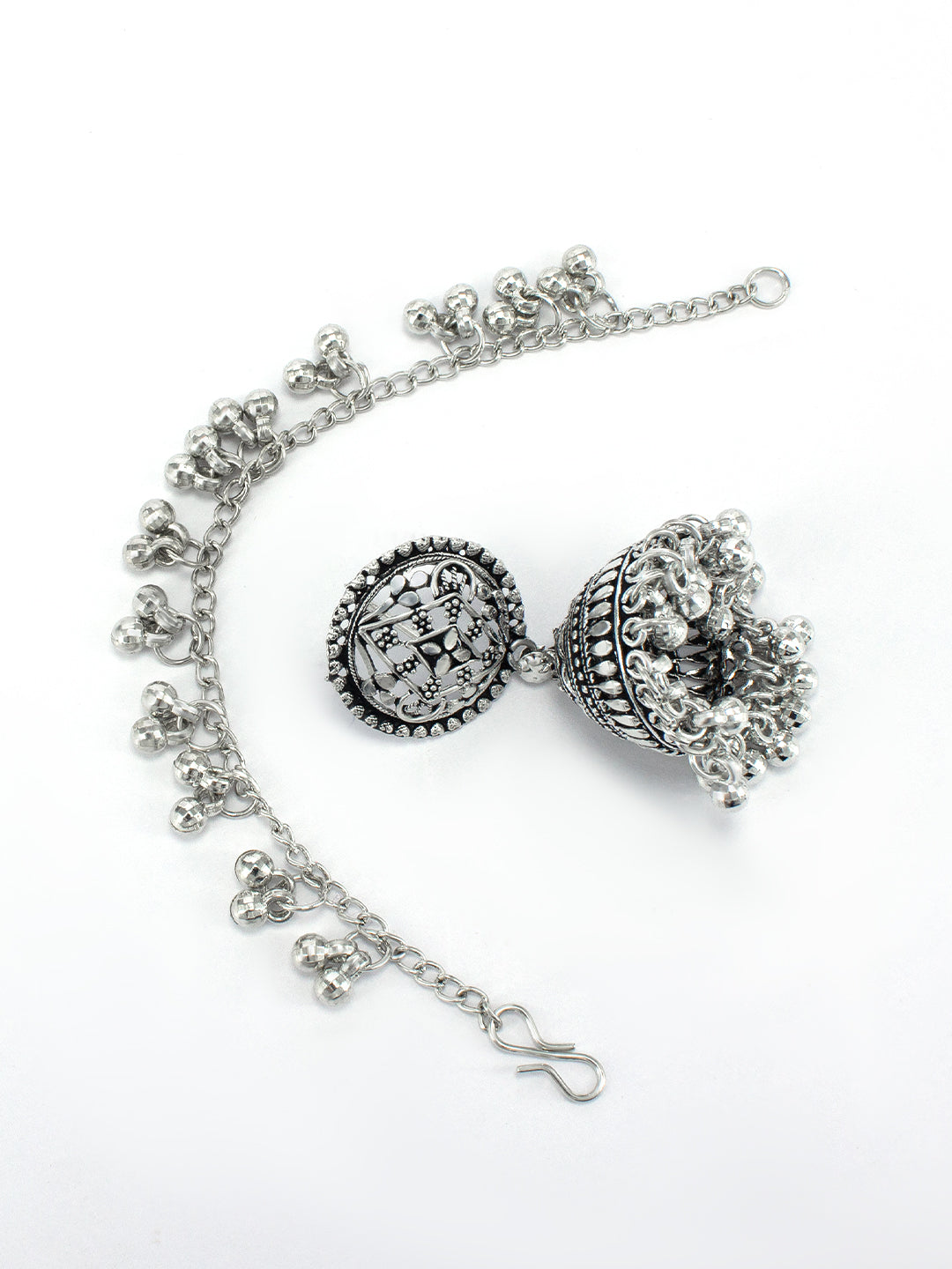 Silver-Plated Dome Shaped Jhumkas With Hair Chain