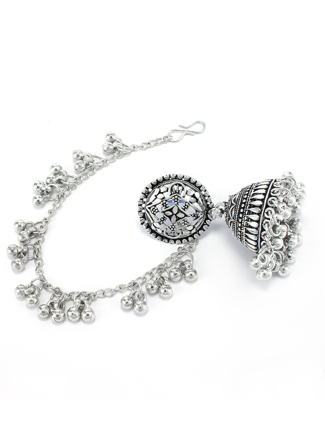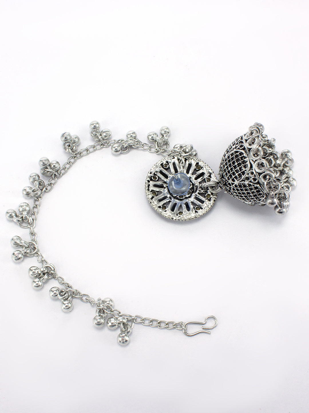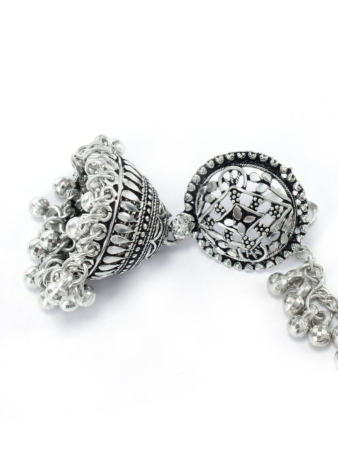 Silver-Plated Dome Shaped Jhumkas With Hair Chain