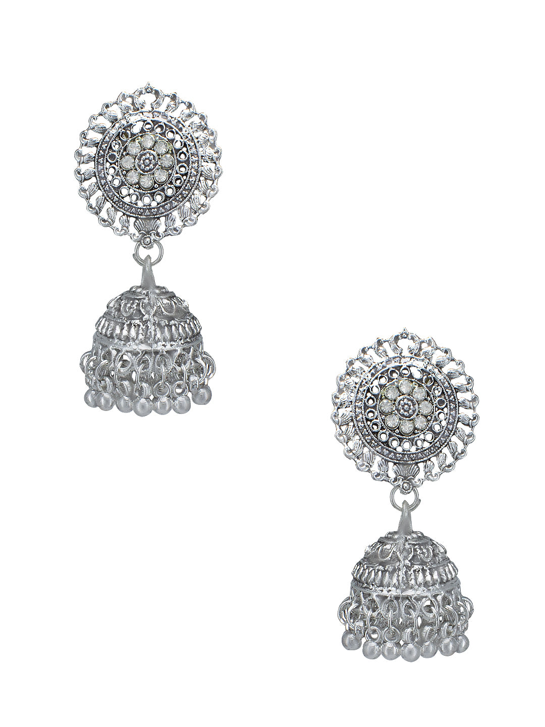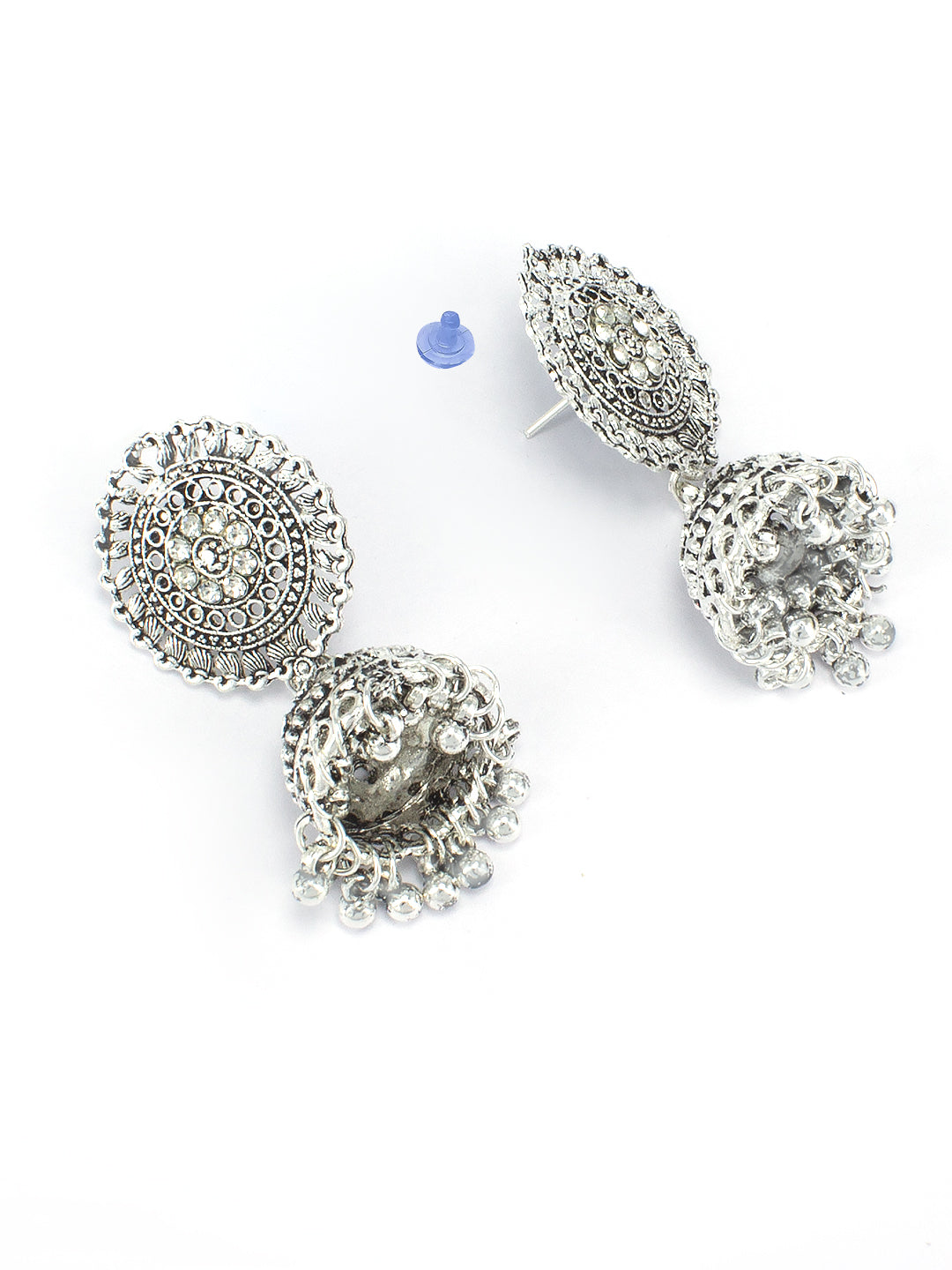A pair of matching jhumka earrings, each secured with a post back closure
