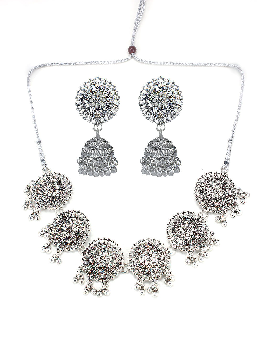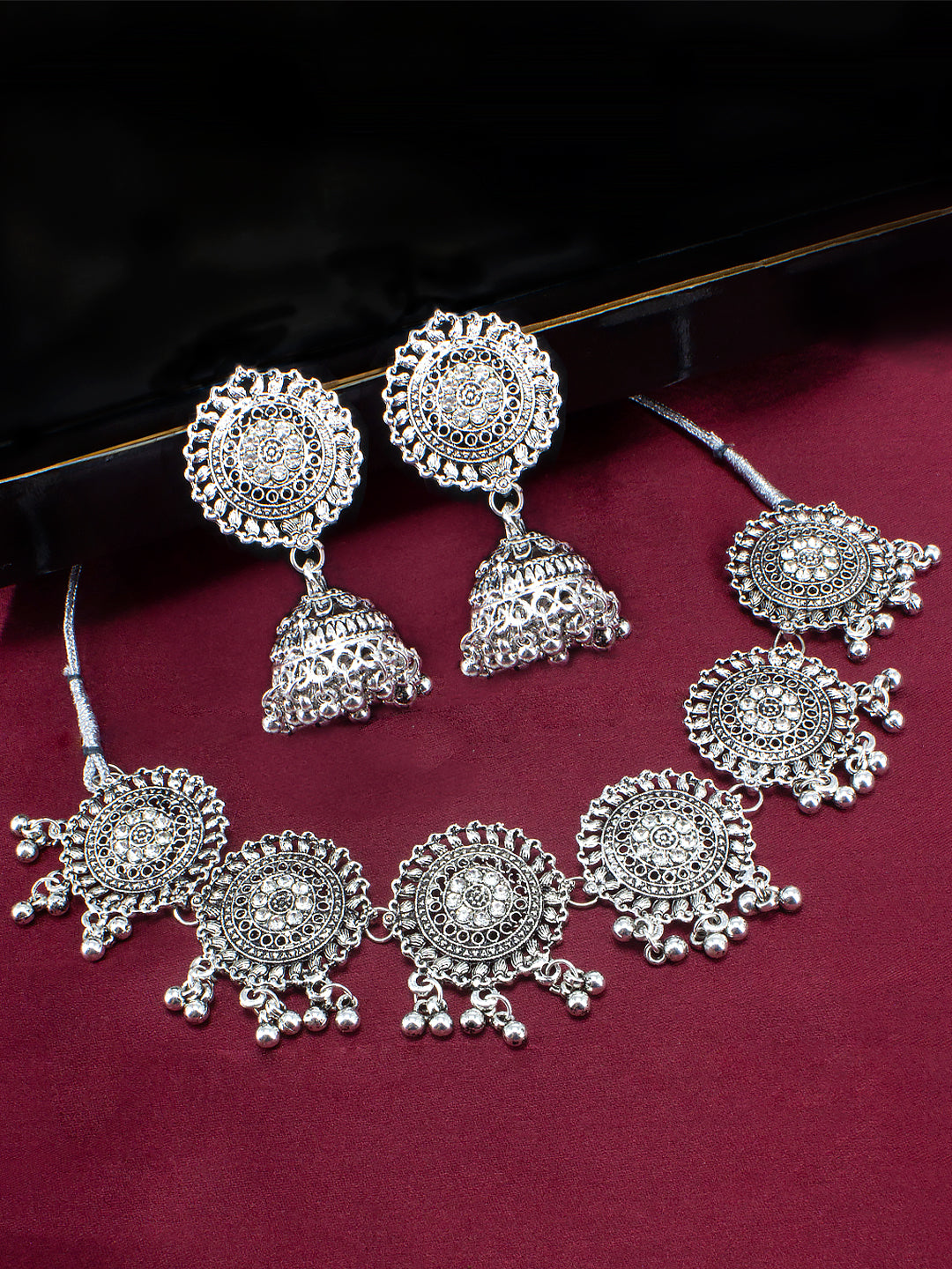 This jewellery set consists of a necklace and a pair of jhumka earrings