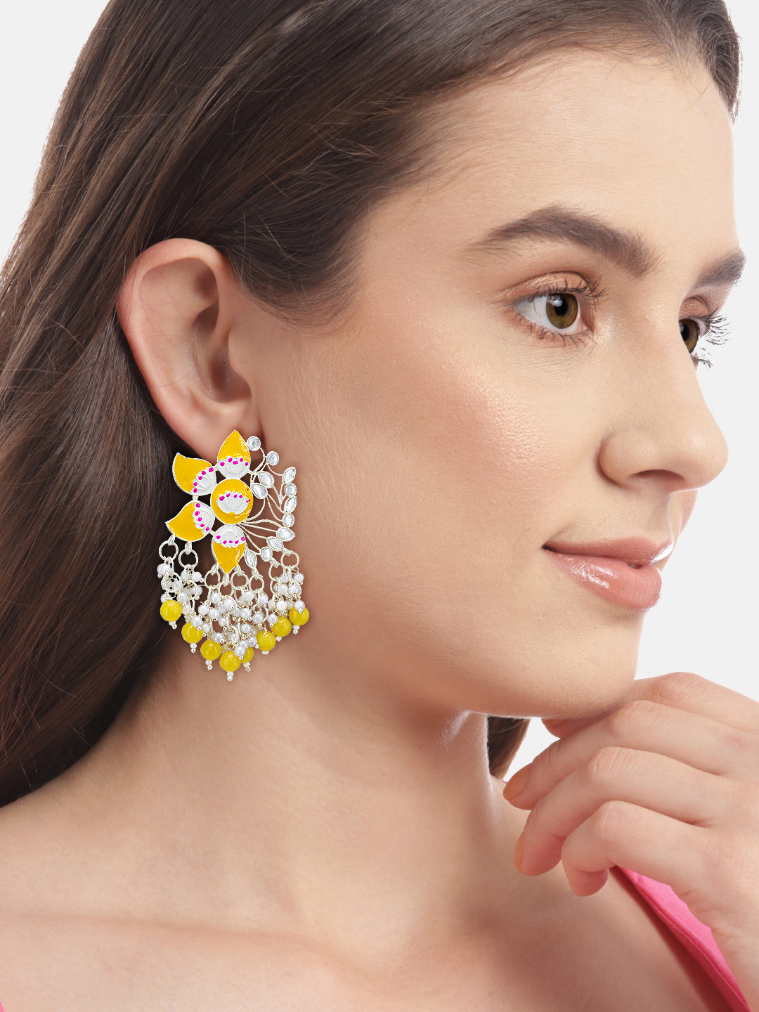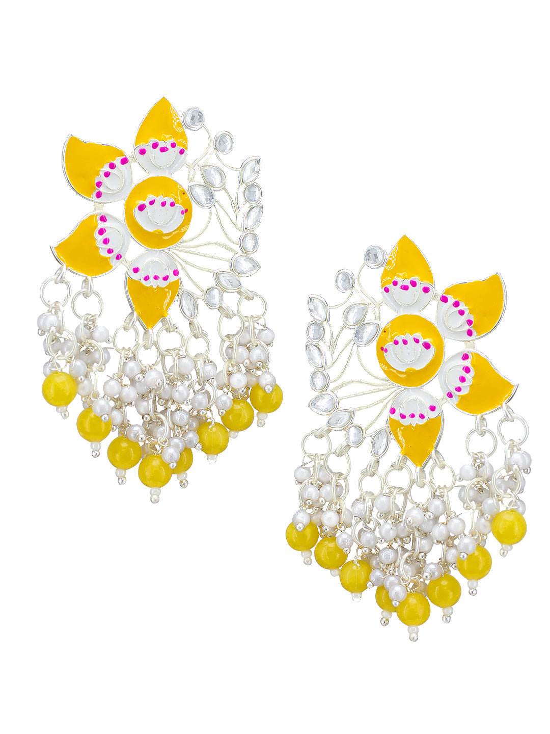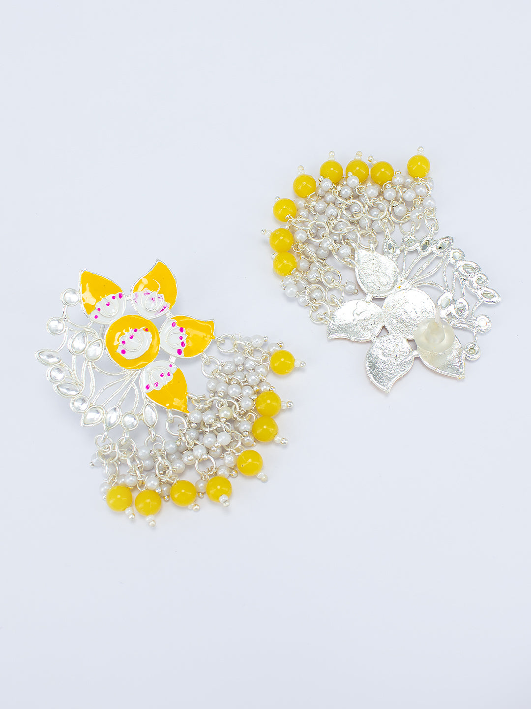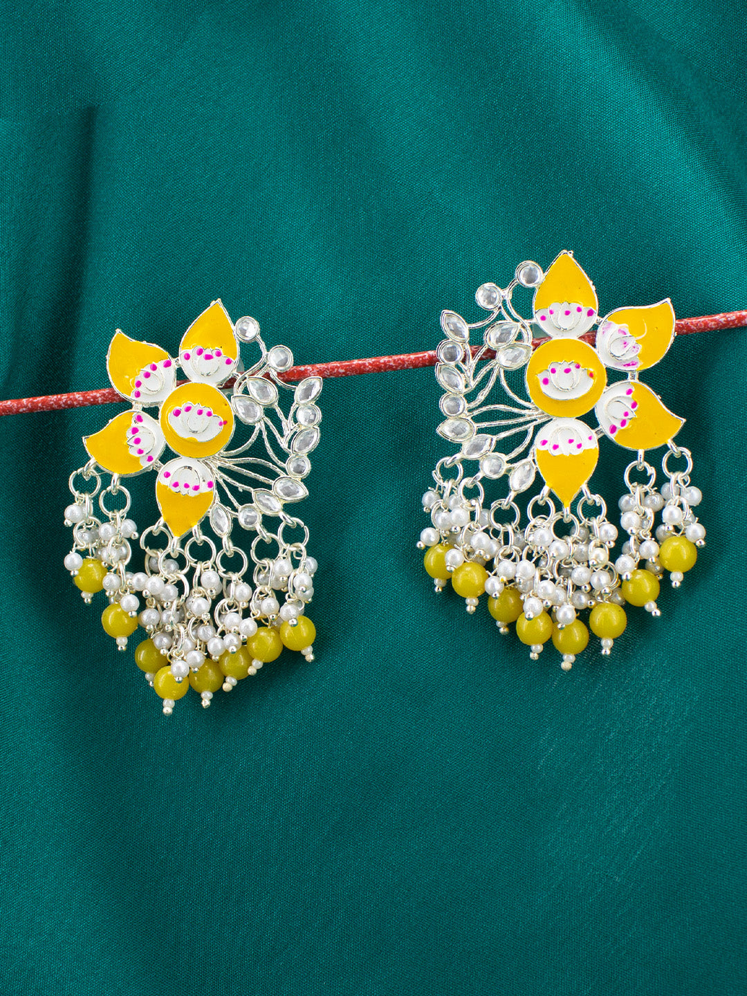 Yellow floral chandbalis, silver-plated, has artificial beads
