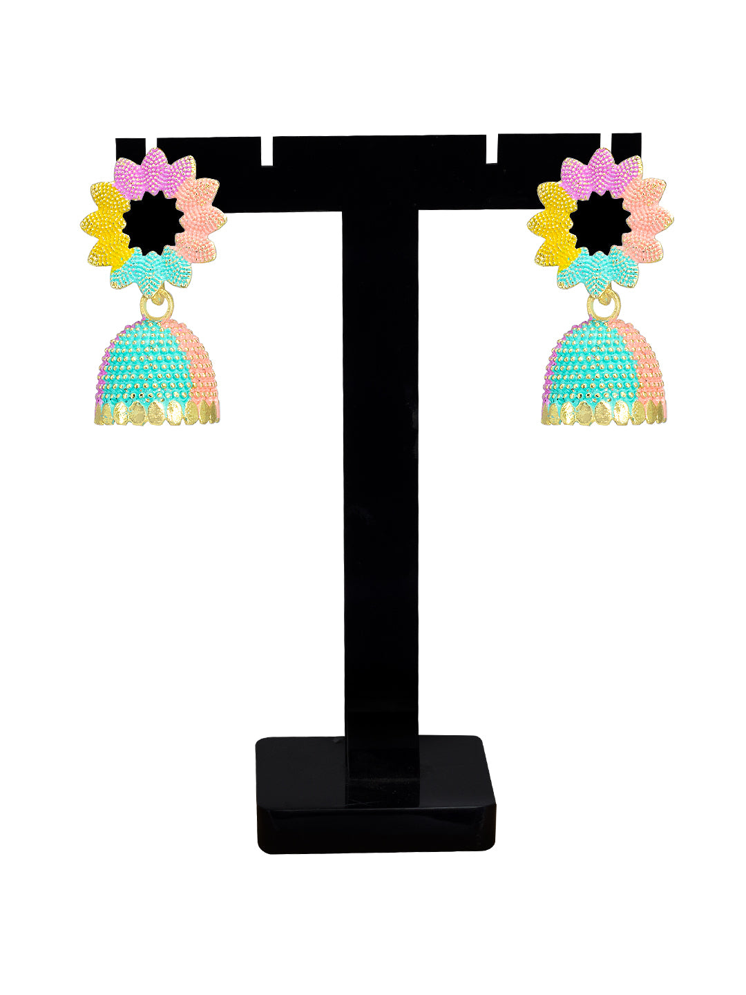 These jhumki earrings are gold plated, has multicolored details and secured with post & back closure.