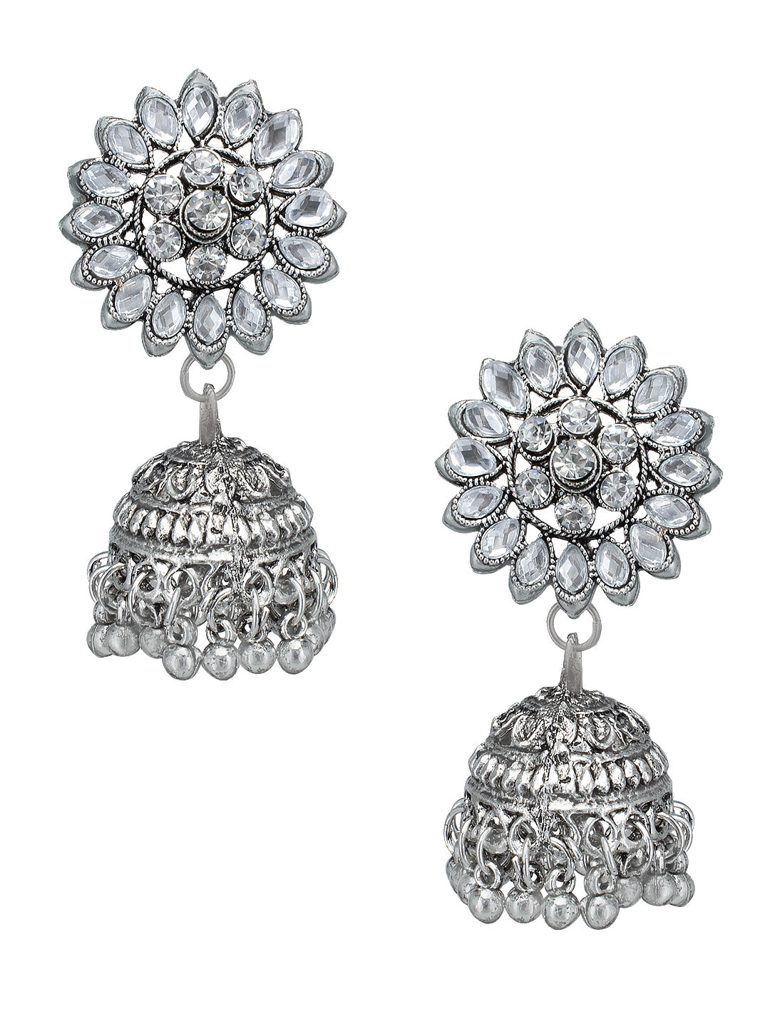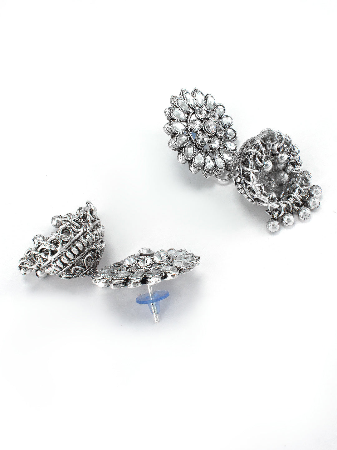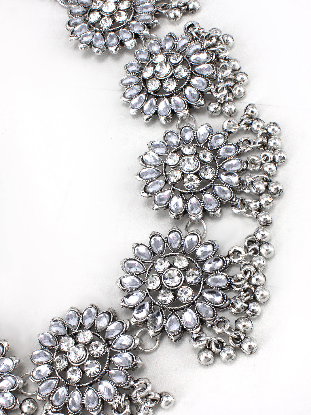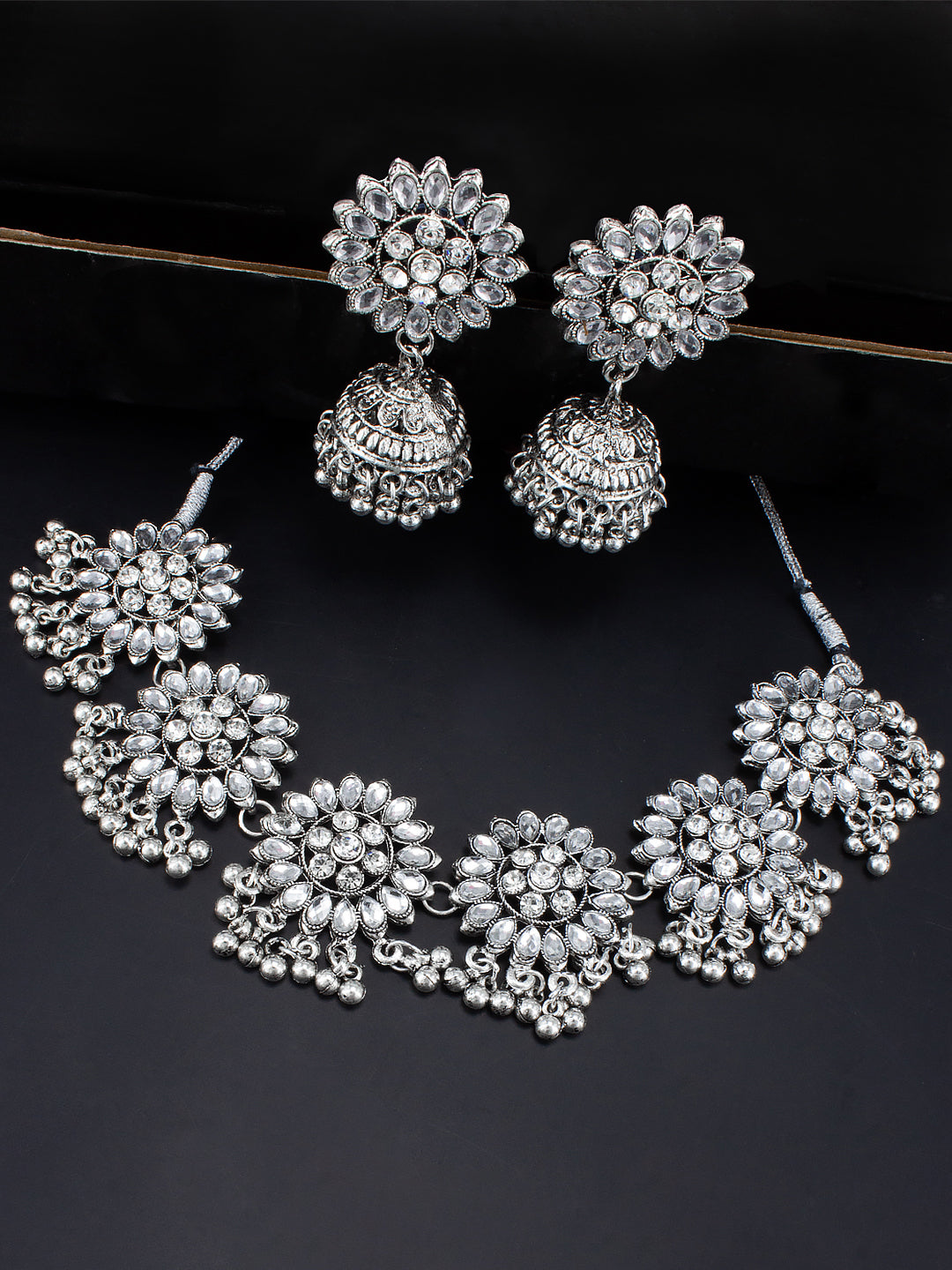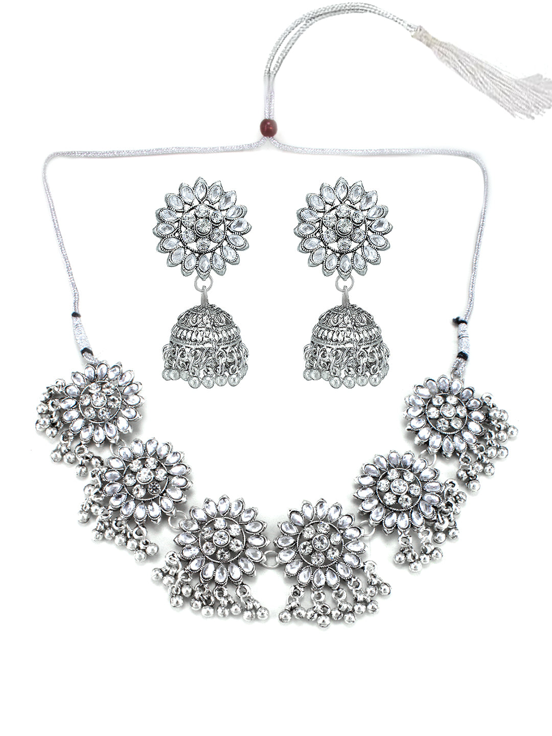 Silver-Oxidised Floral Stone & Beades Studded Jewellery Set
