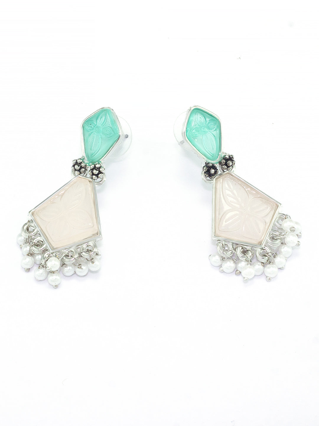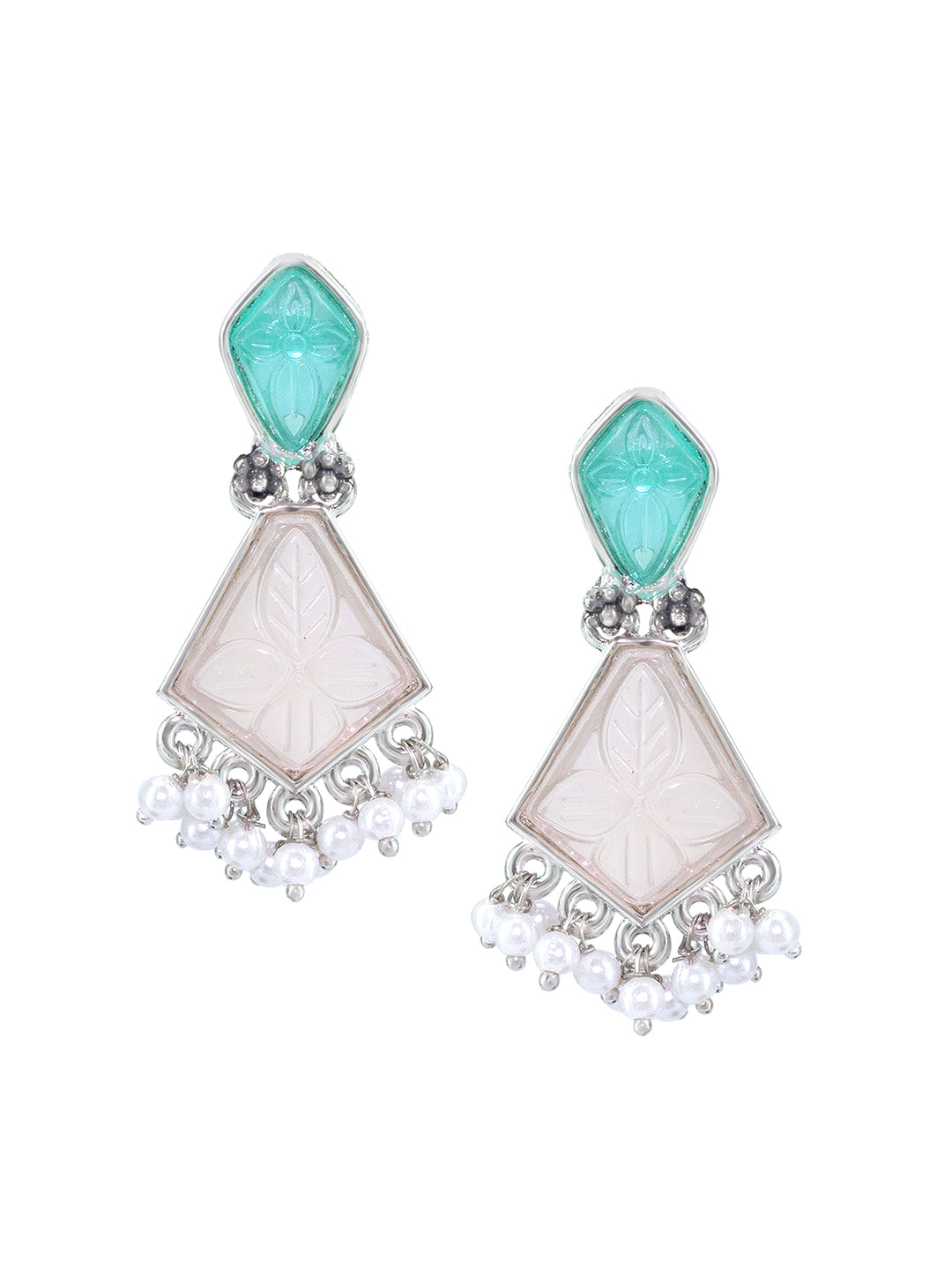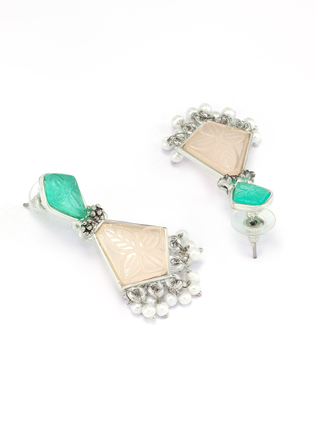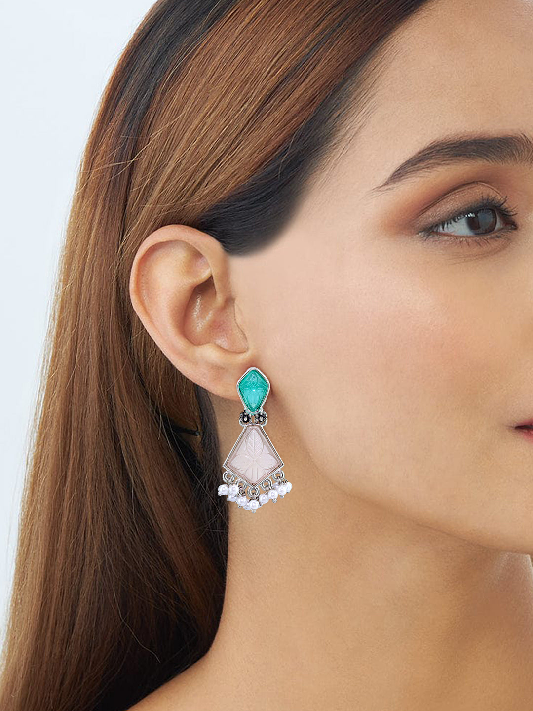 Silver-Plated Geometric Stone Studded Drop Earrings