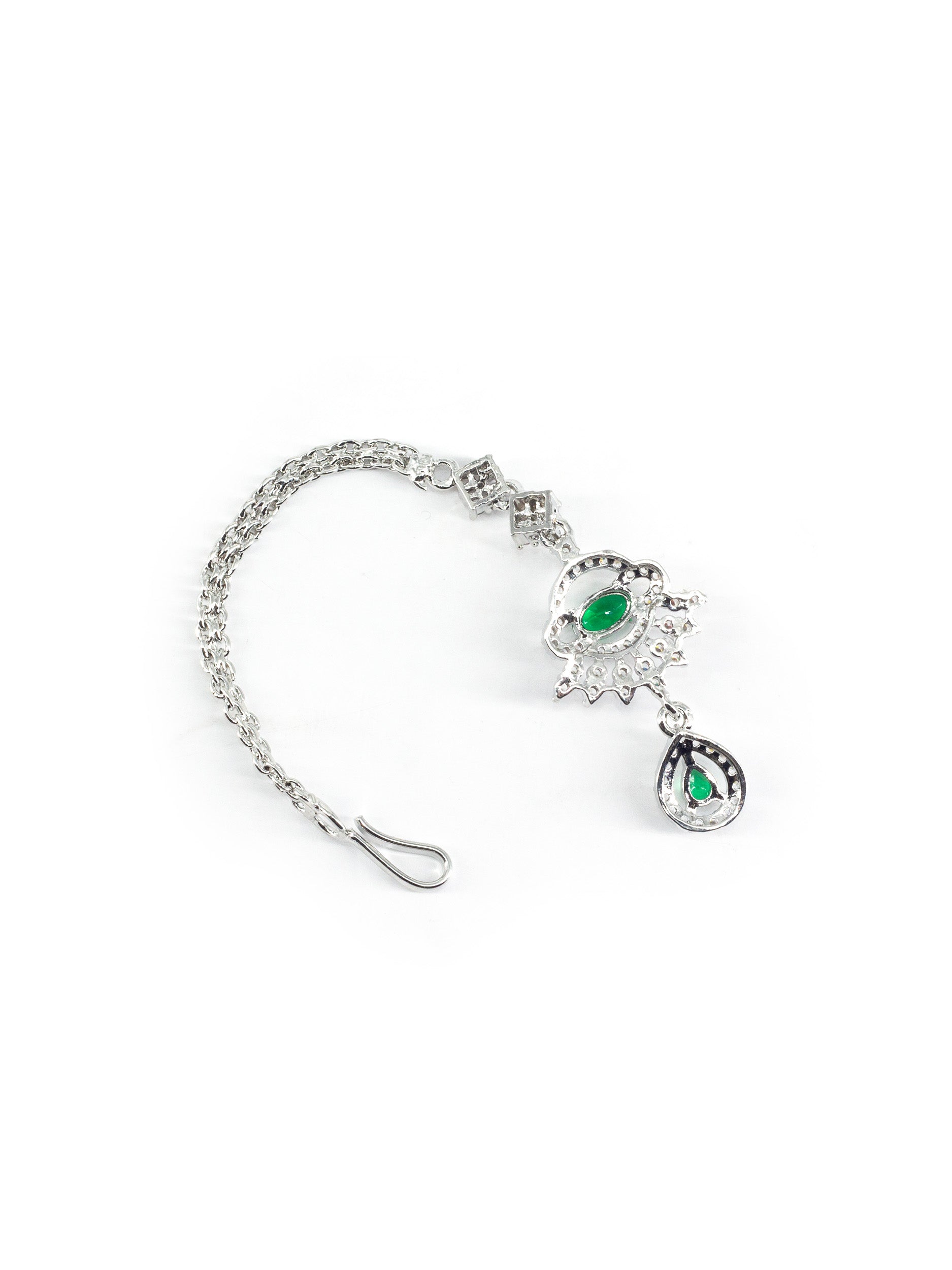 Silver Plated Green American Diamond Drop Maang Tikka for Women Secured with S-Hook Closure.