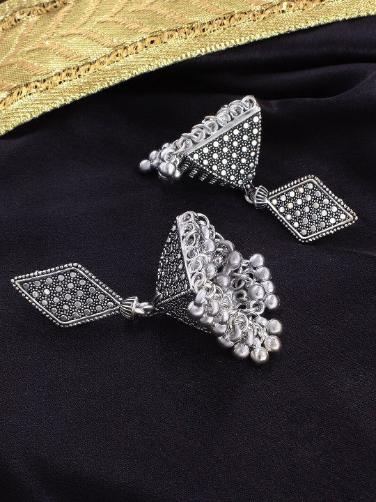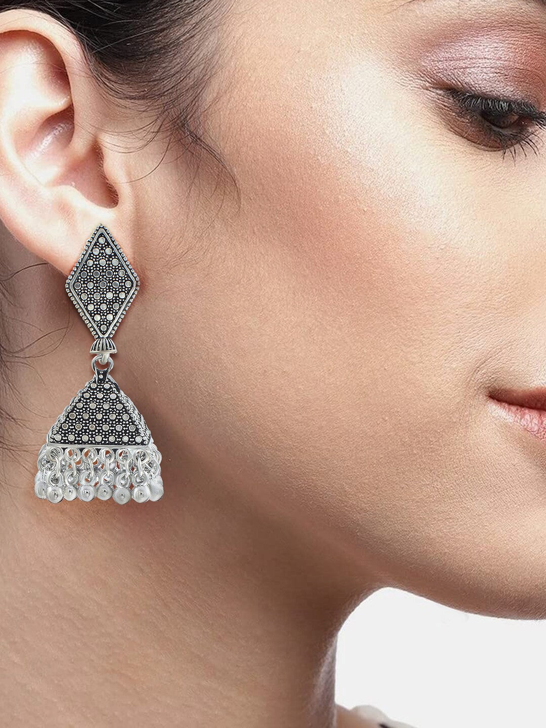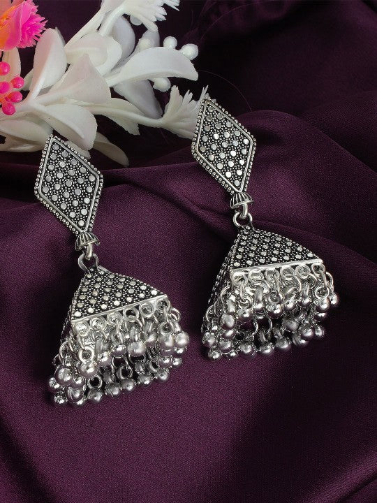 Silver Plated Dome Shaped Oxidised Jhumkas, secured with post & back closure.