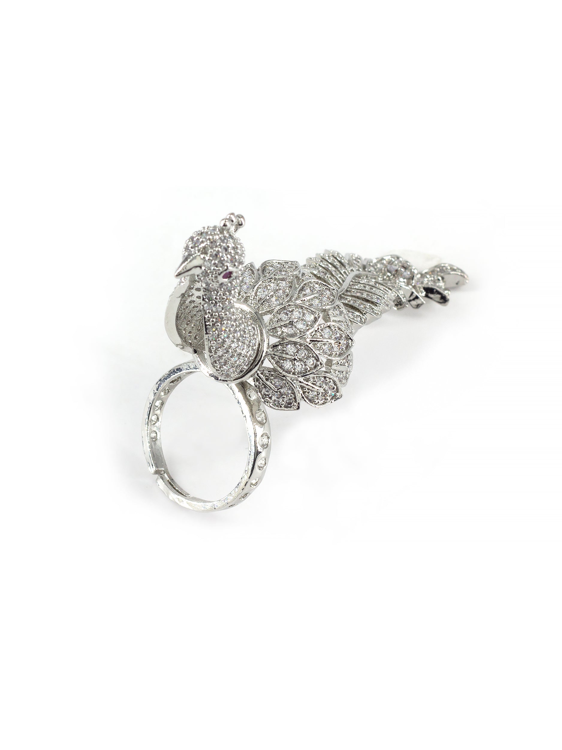 Silver Plated Peacock AD Adjustable Finger Ring for Women secured with Adjustable Closure.
