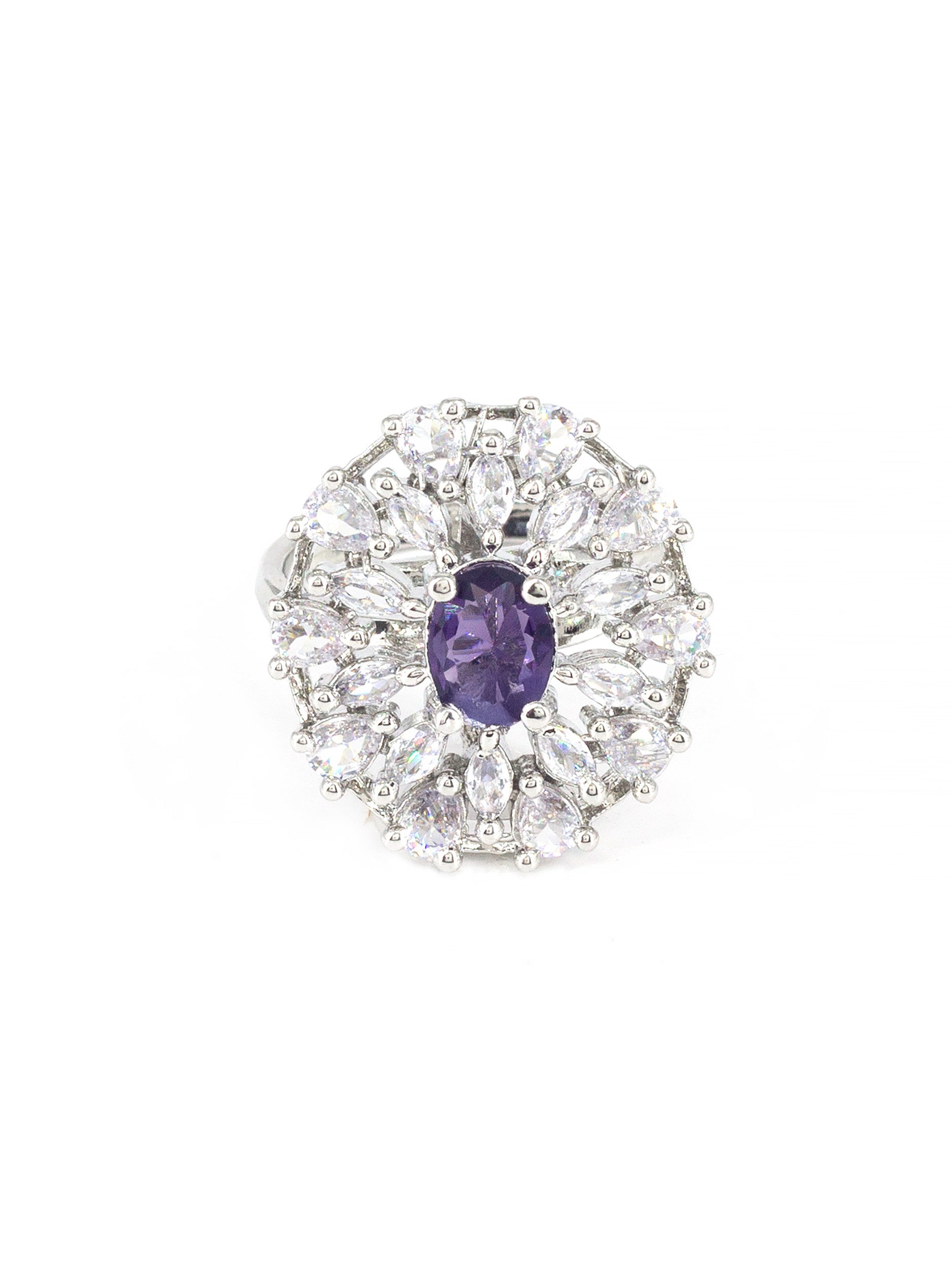 Silver Plated Purple American Diamond Adjustable Ring for Women secured with adjustable closure.