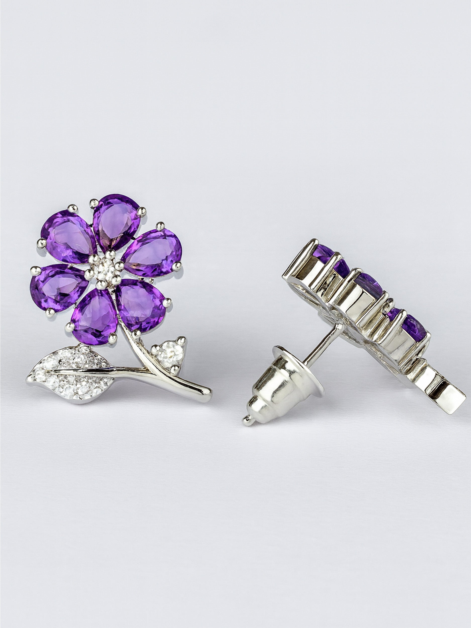 Silver Plated Purple AD Floral Stud Earrings for Women