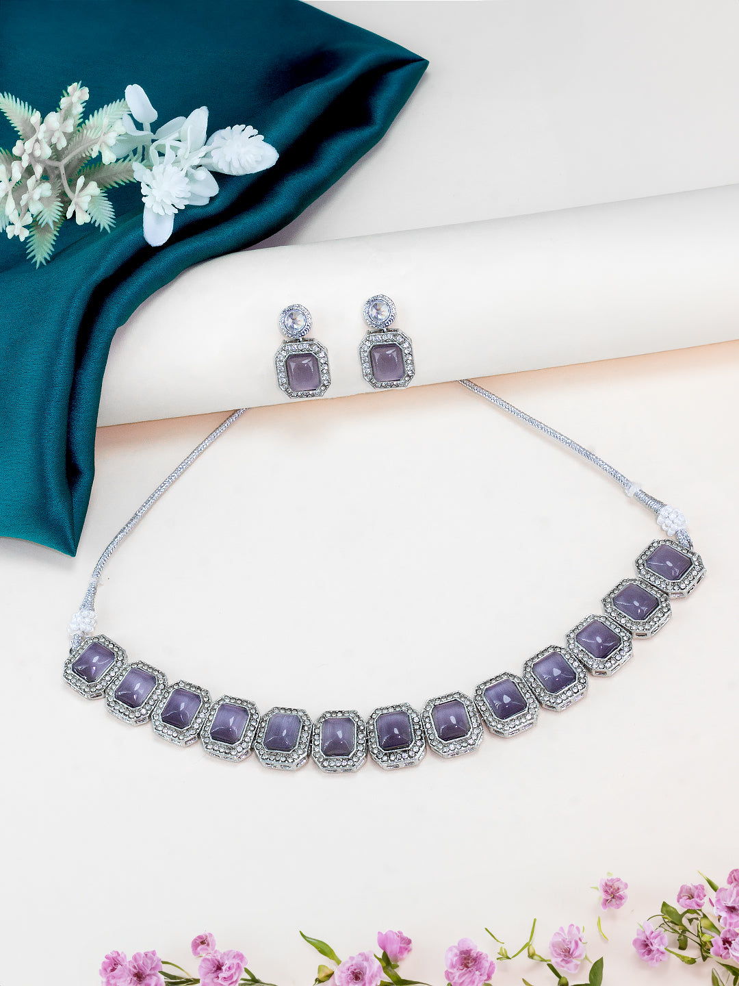 Silver-plated choker necklace, has lavender and white kundan stone-studded details
